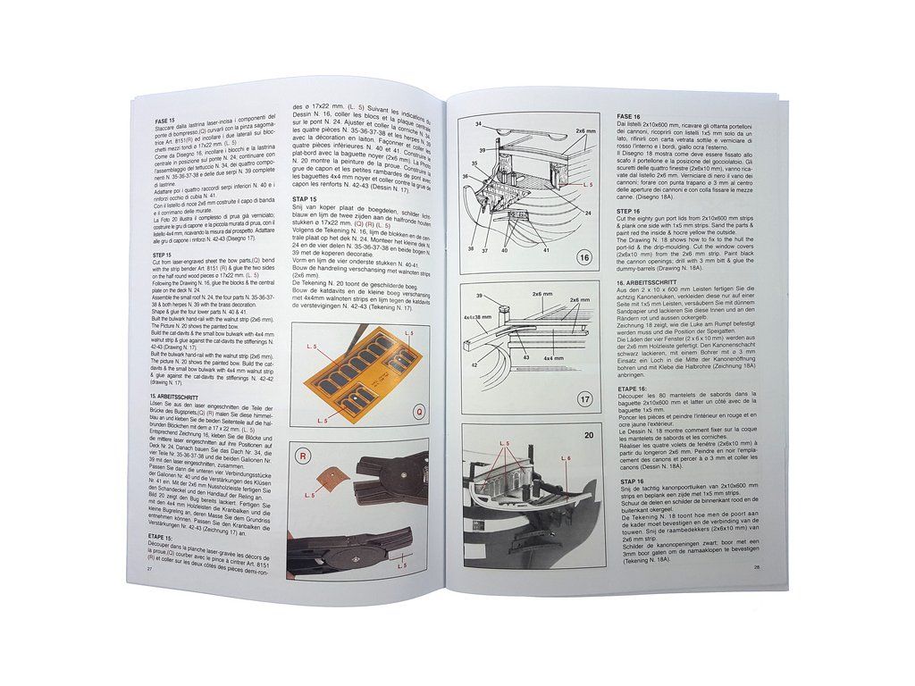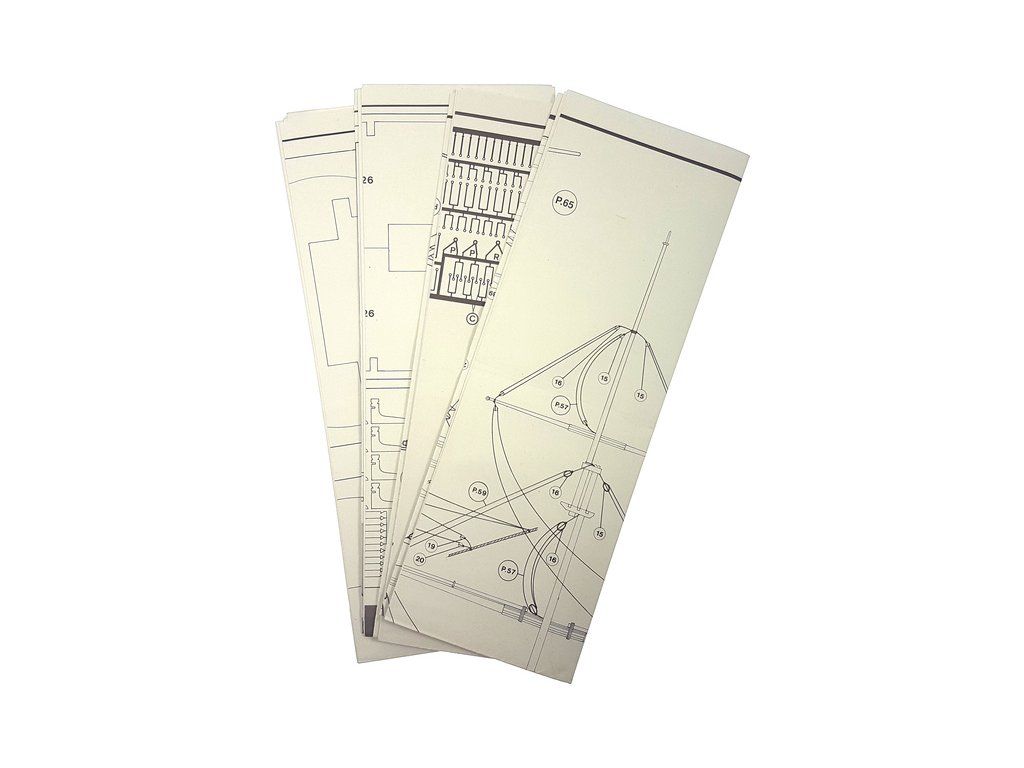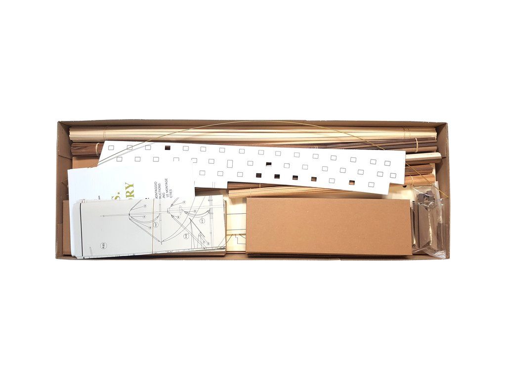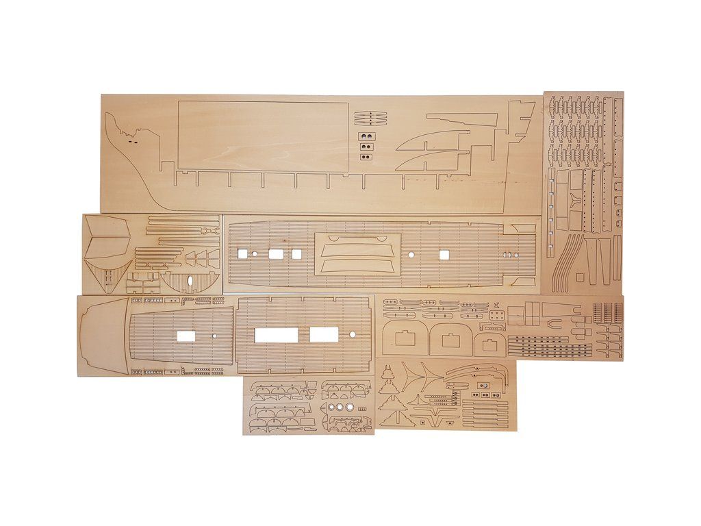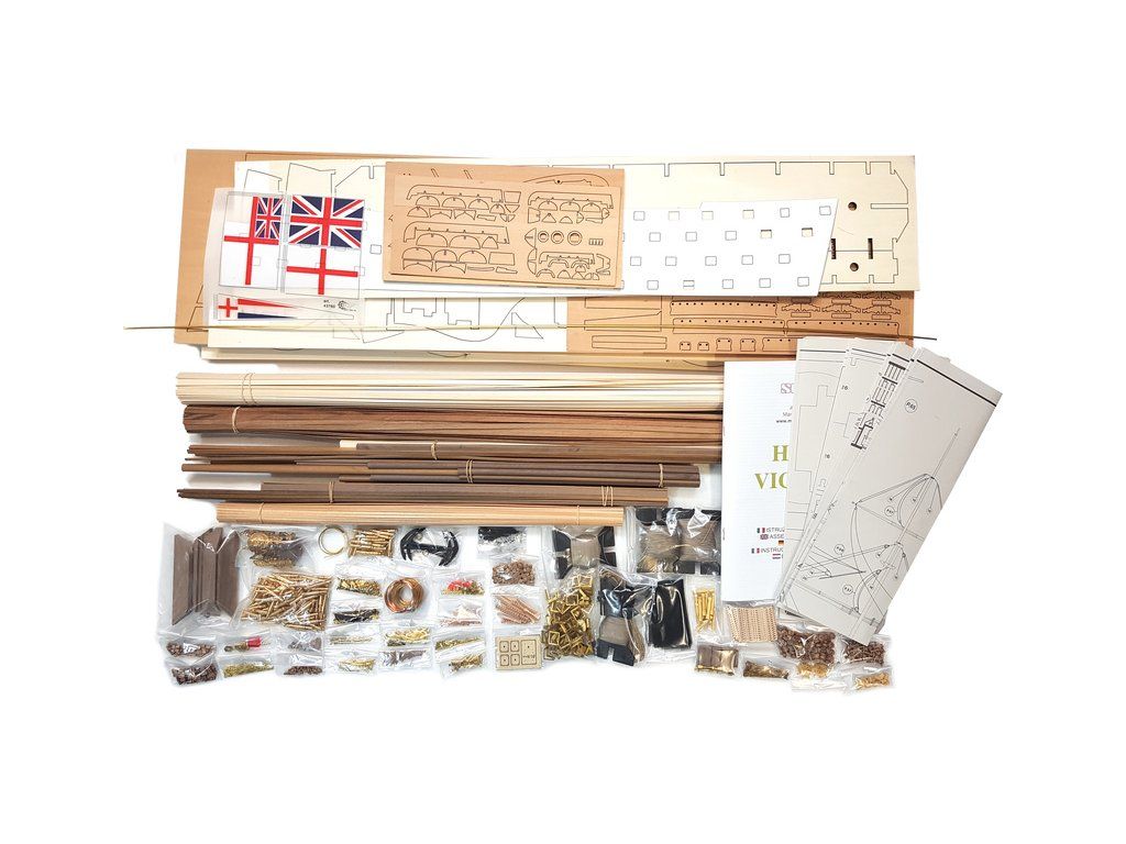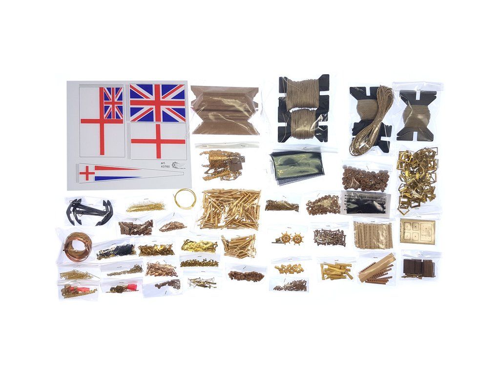 Balení obsahuje laserem řezané dřevěné díly, plaňky, paluby, stožáry, kovové a dřevěné kování, kovové odlitky a dekorace vyleptané z mosazi. Stavební plán a vícejazyčný návod.