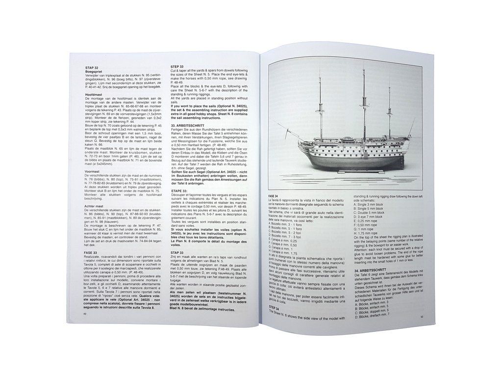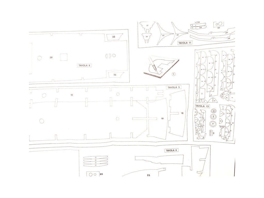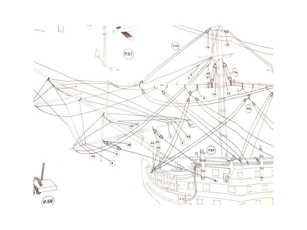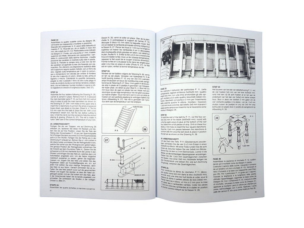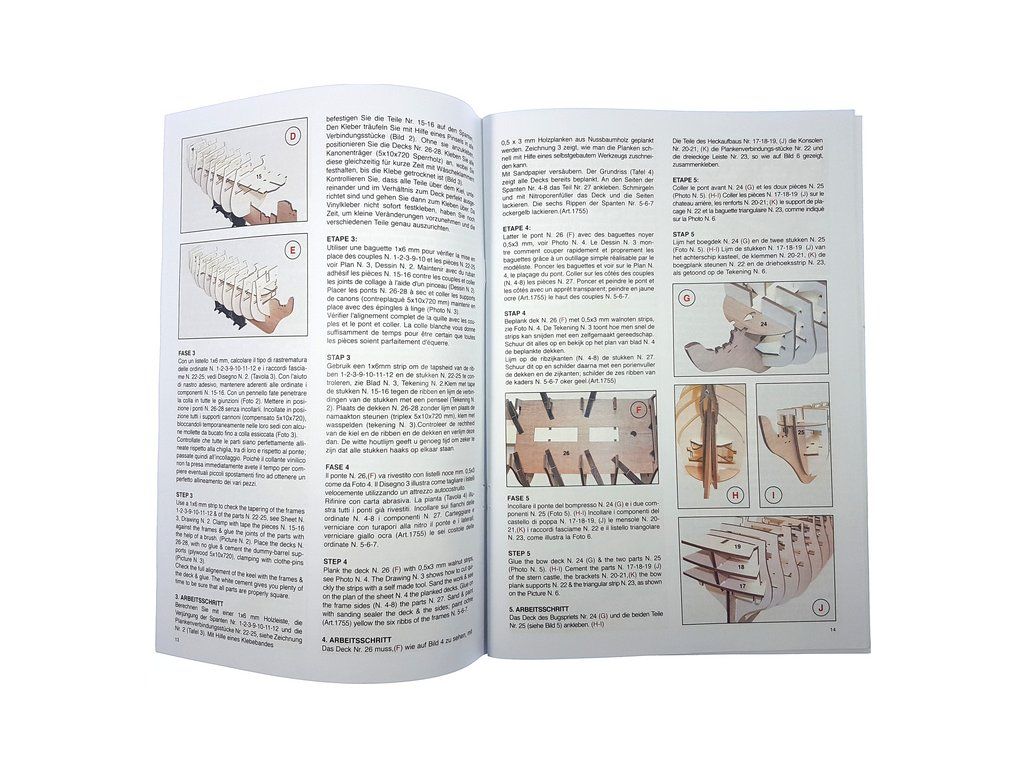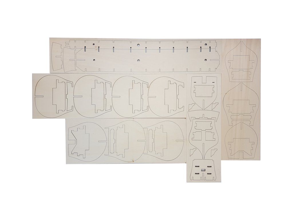 Balení obsahuje laserem řezané dřevěné díly, plaňky, paluby, stožáry, kovové a dřevěné kování, kovové odlitky a dekorace vyleptané z mosazi. Stavební plán a vícejazyčný návod.