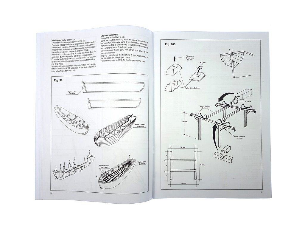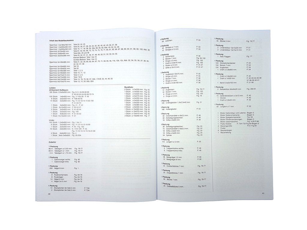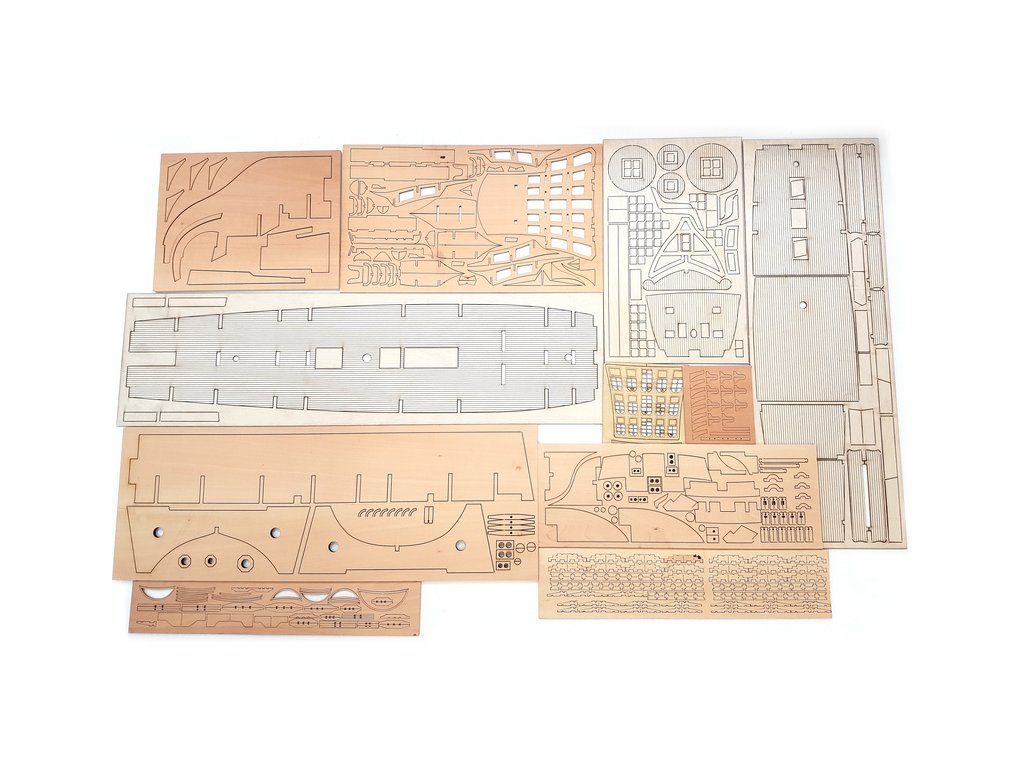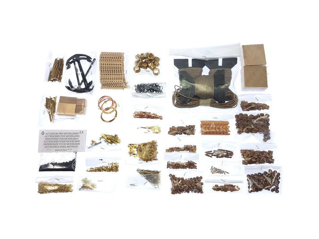 Balení obsahuje laserem řezané dřevěné díly, plaňky, paluby, stožáry, vlajky, kovové a dřevěné kování, kovové odlitky a dekorace vyleptané z mosazi. Stavební plány, vícejazyčný manuál.