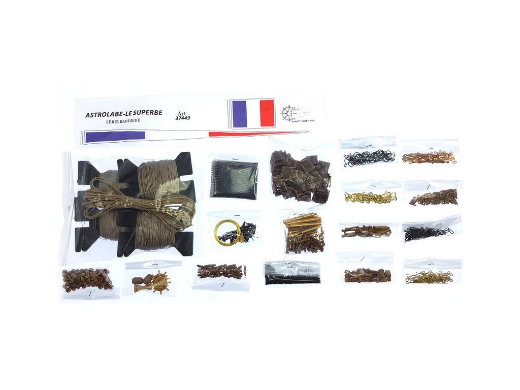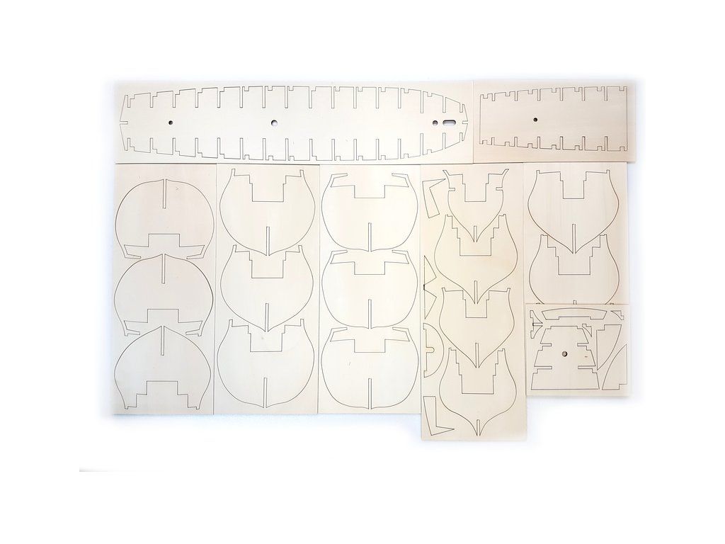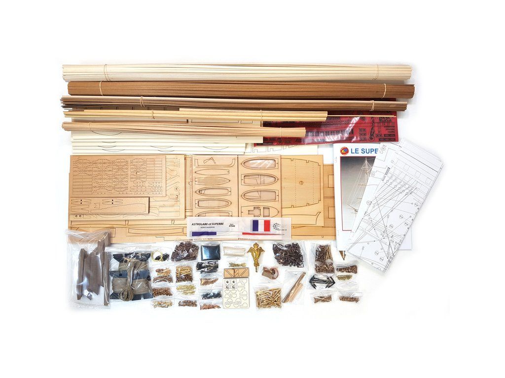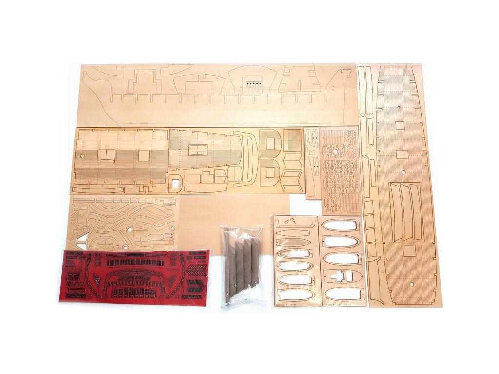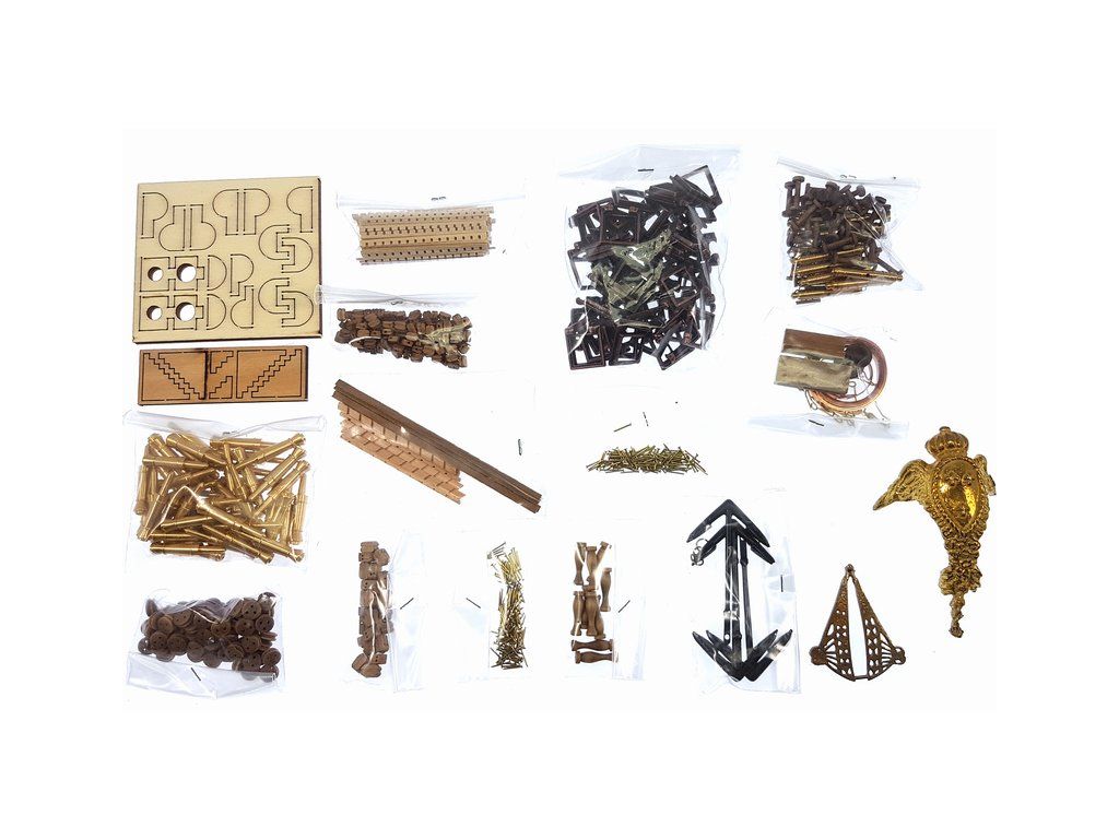 Balení obsahuje laserem řezané dřevěné díly, plaňky, paluby, stožáry, kovové a dřevěné kování, kovové odlitky a dekorace vyleptané z mosazi. Díly na výrobu stojánku. Podrobný vícejazyčný manuál a stavební plány.