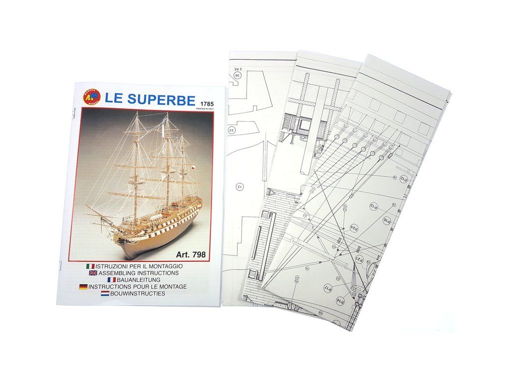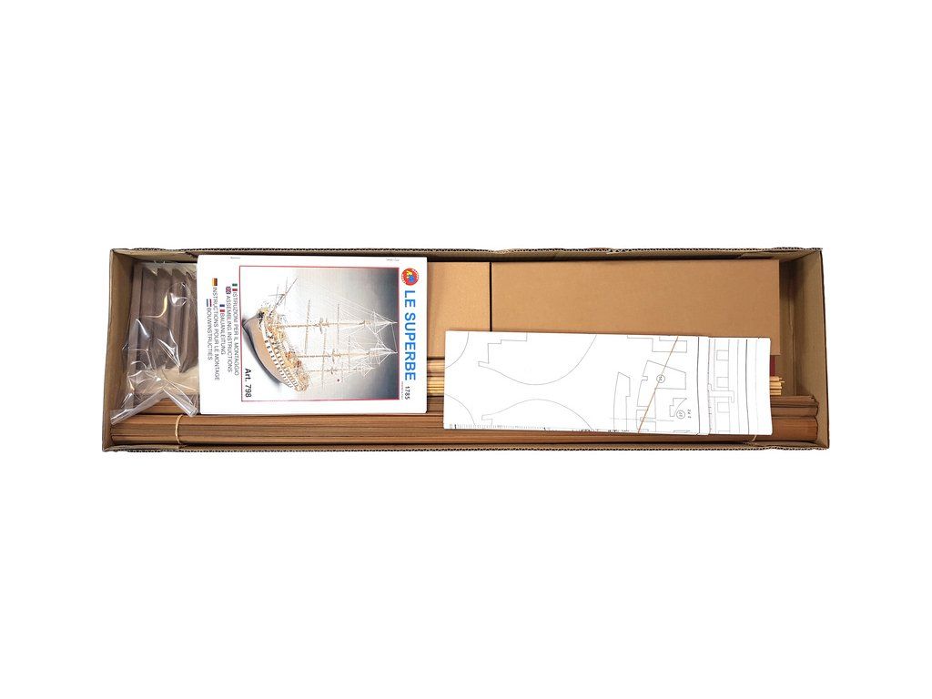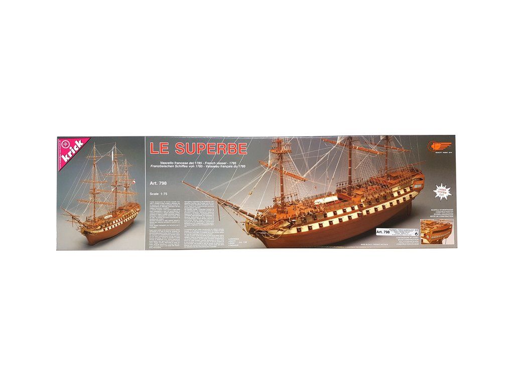Stavebnice neplovoucího modelu lodi Le Superbe v měřítku 1:75. Krásný zmenšený model slavné francouzské lodi se 74 děly z roku 1784, v detailním provedením a s bohatým zdobením. Délka modelu 1125 mm. Kit obsahuje dřevěné díly, dvojité plaňkování, kovové odlitky dekorací a podrobný stavení plán.