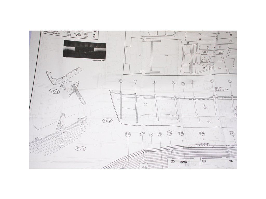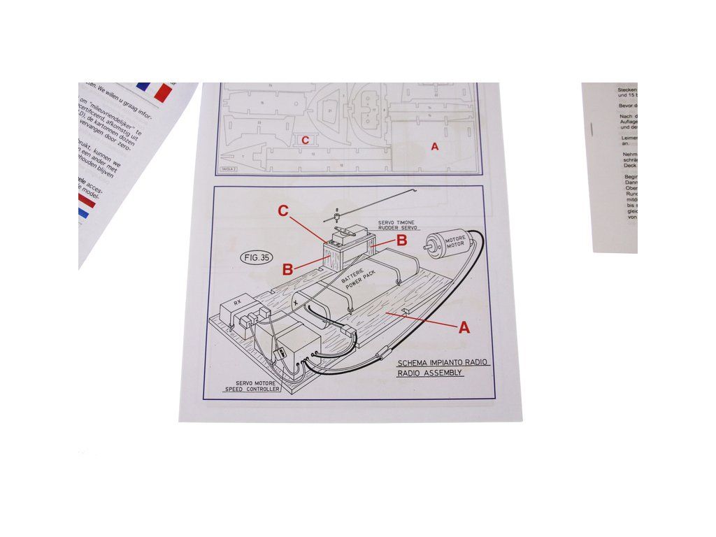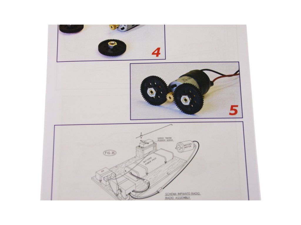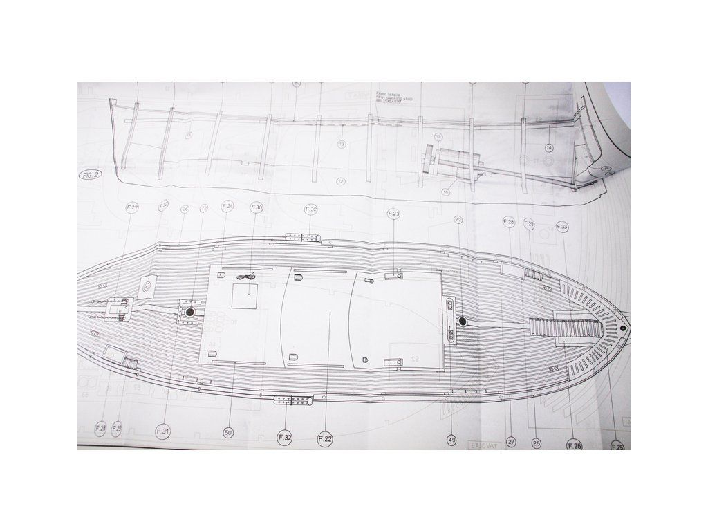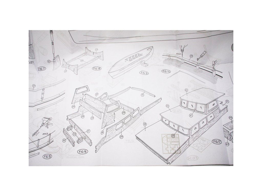 Balení obsahuje sadu překližkových dílů, sadu dřevěných lišt o různém průřezu, blistr s drobnými díly, díly z mosazi, dvě lodní hřídele s lodními šrouby prům. 40mm a závity M4, sadu výkresů a vícejazyčný manuál.