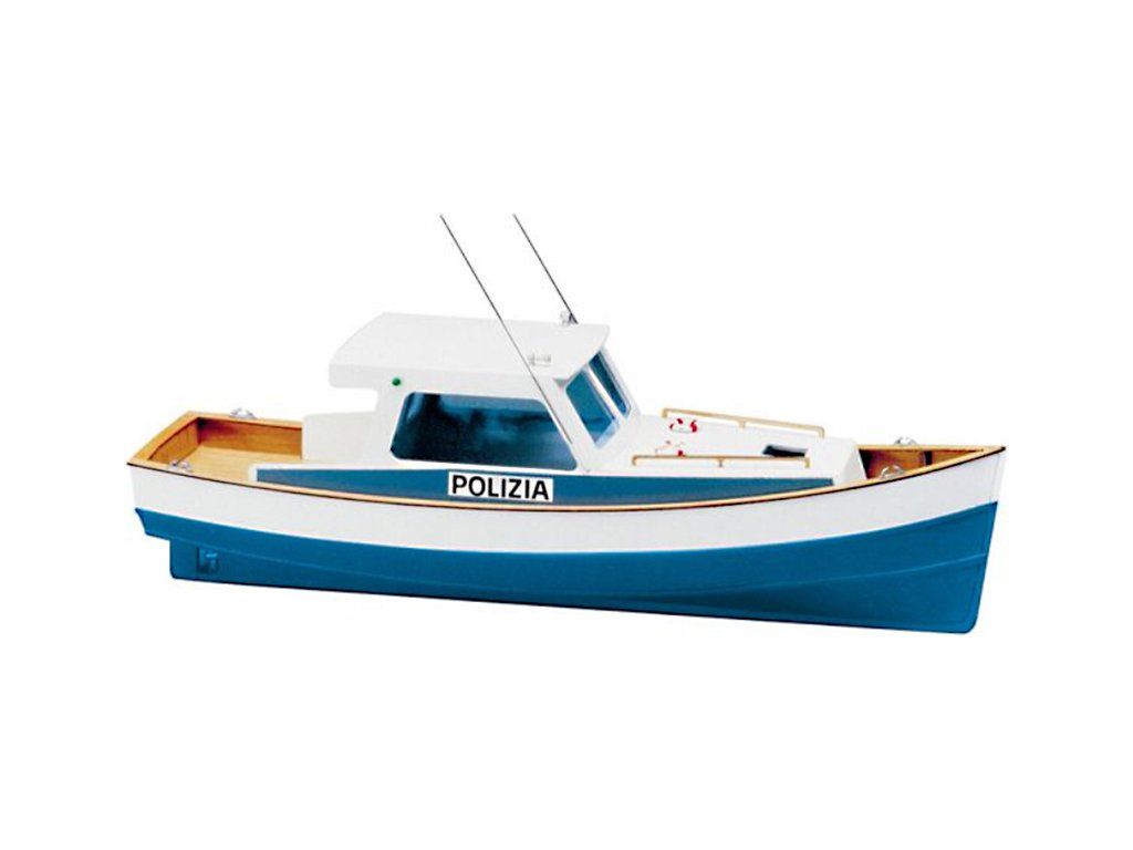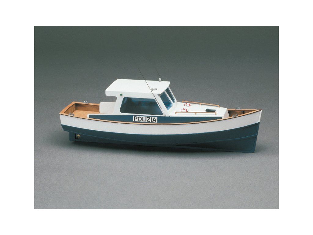Stavebnice neplovoucího modelu lodi Mantua Model Policejní člun v měřítku 1:35 a délce 400mm pro začínající modeláře. Obsahuje dřevěné díly, drobné díly pro dokončení modelu, stavební plány a návod s výkresy řezů. Lze jej vyrobit i jako plovoucí.