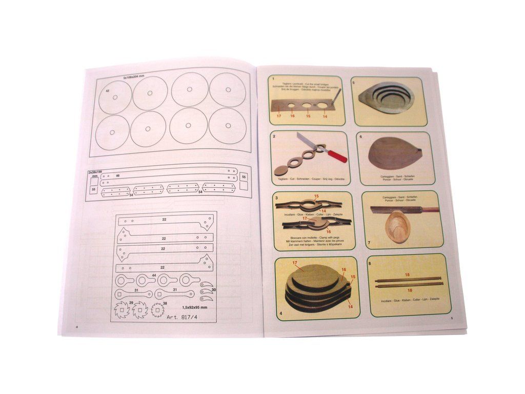 Balení obsahuje laserem vyřezávané dřevěné díly, kovové odlitky, lana, detailní obrázkový návod ke stavbě.