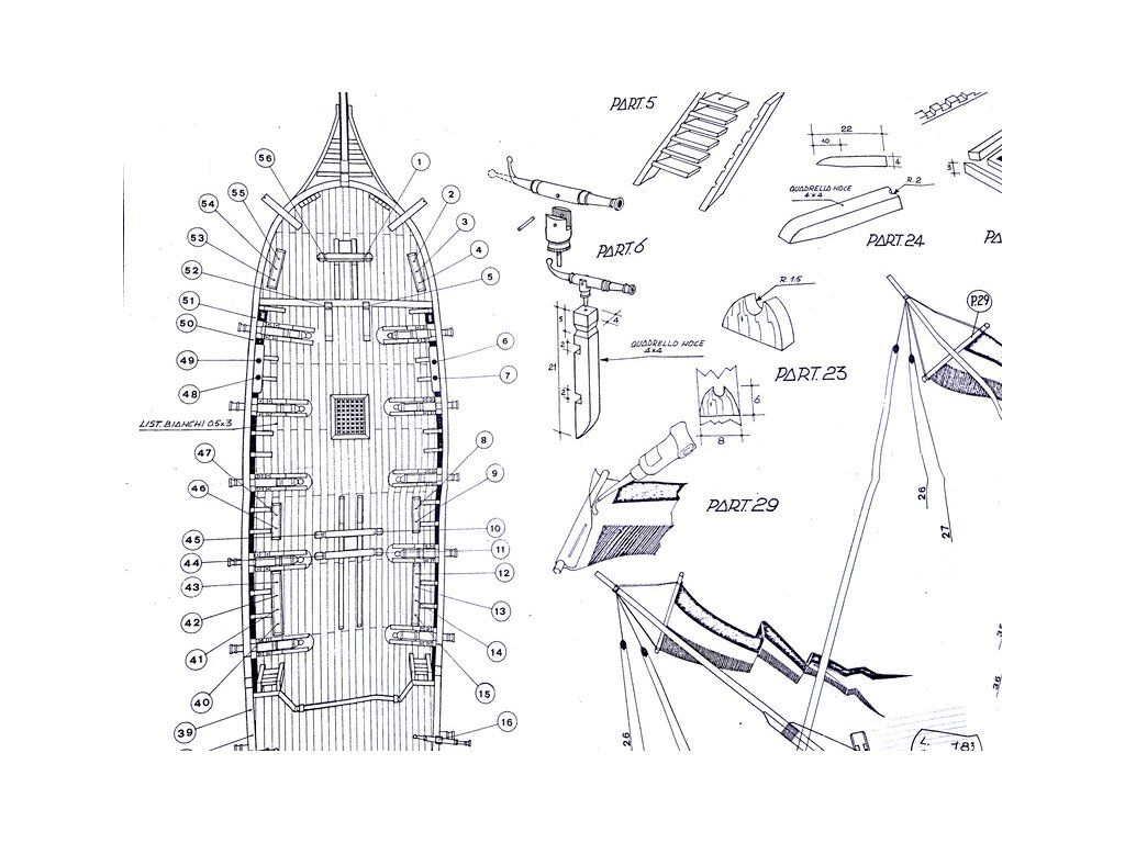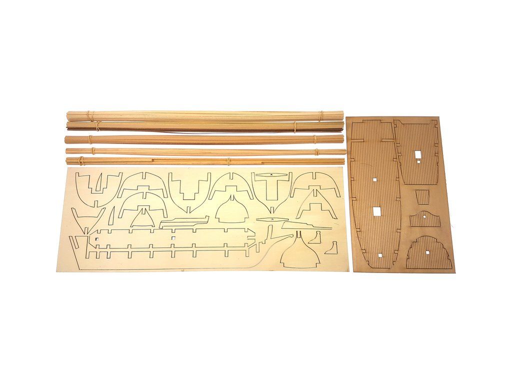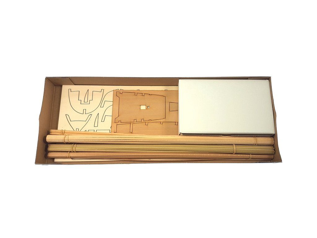 Balení obsahuje laserem řezané dřevěné díly, plaňky, stožáry, vlajky, lanoví, kovové a dřevěné kování a dekorace z mosazi. Stavební plány a vícejazyčný manuál.