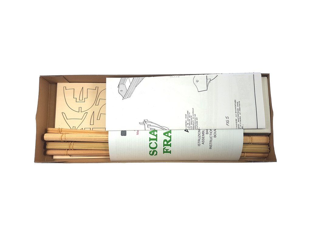 Stavebnice neplovoucího modelu lodi Sciabeggio v měřítku 1:49. Loď byla používána Francouzi ve středozemním moři v boji proti sacárenským pirátům. Kit modelu lodi obsahuje rámovou konstrukci, dvojité plaňkování pro vetší stabilitu a lehčí stavbu. Kování z mosazi. Délka 52 cm.
