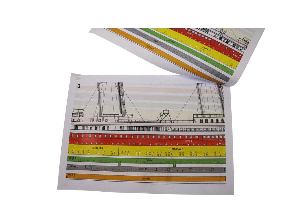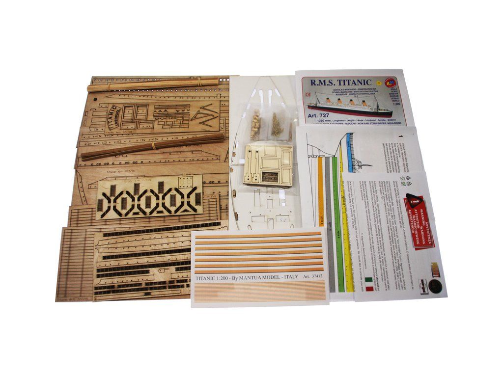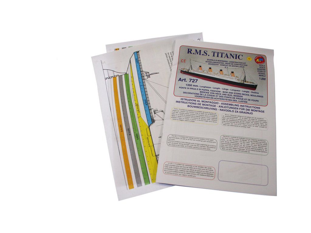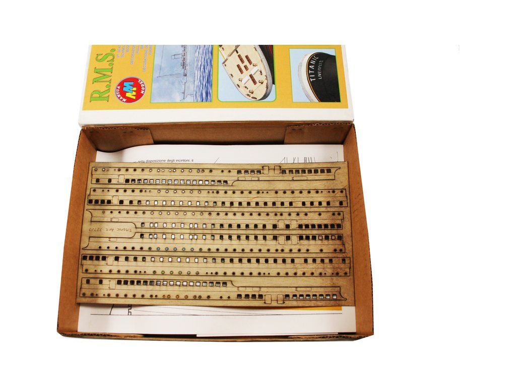 Mantua Model Titanic 1:200 sada č.3 kit v měřítku 1: 200 a délce 1350mm. Titanic je vlajkovou lodí řady Mantua Model, který se sestaví z 5 setů. Sada č.3 obsahuje boční panely oken trupu, přídě a zádi, detaily a kování. Součástí je anglický návod a foto detaily.