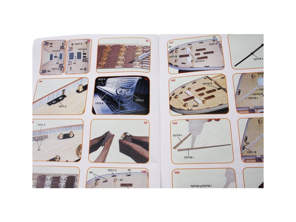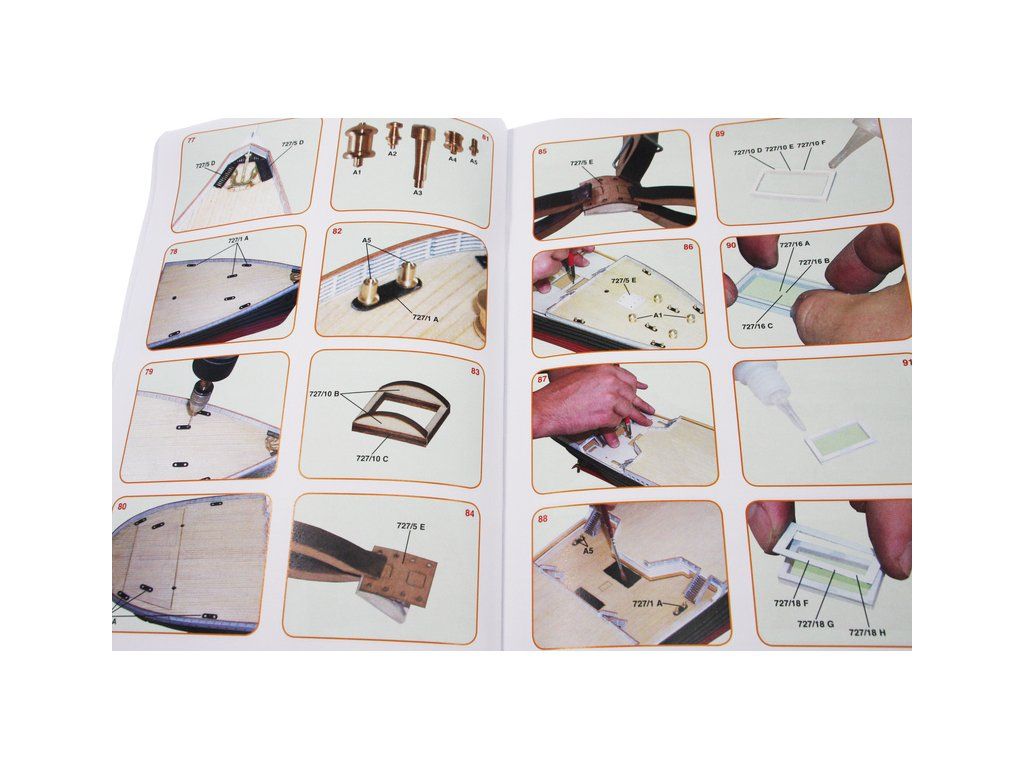 Balení obsahuje sadu překližkových dílů, sáčky s drobnými díly, příslušenství, sadu výkresů a vícejazyčný manuál.