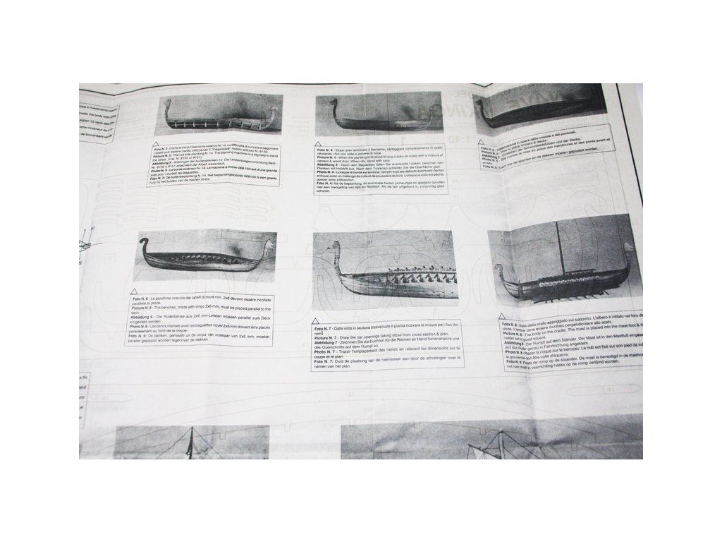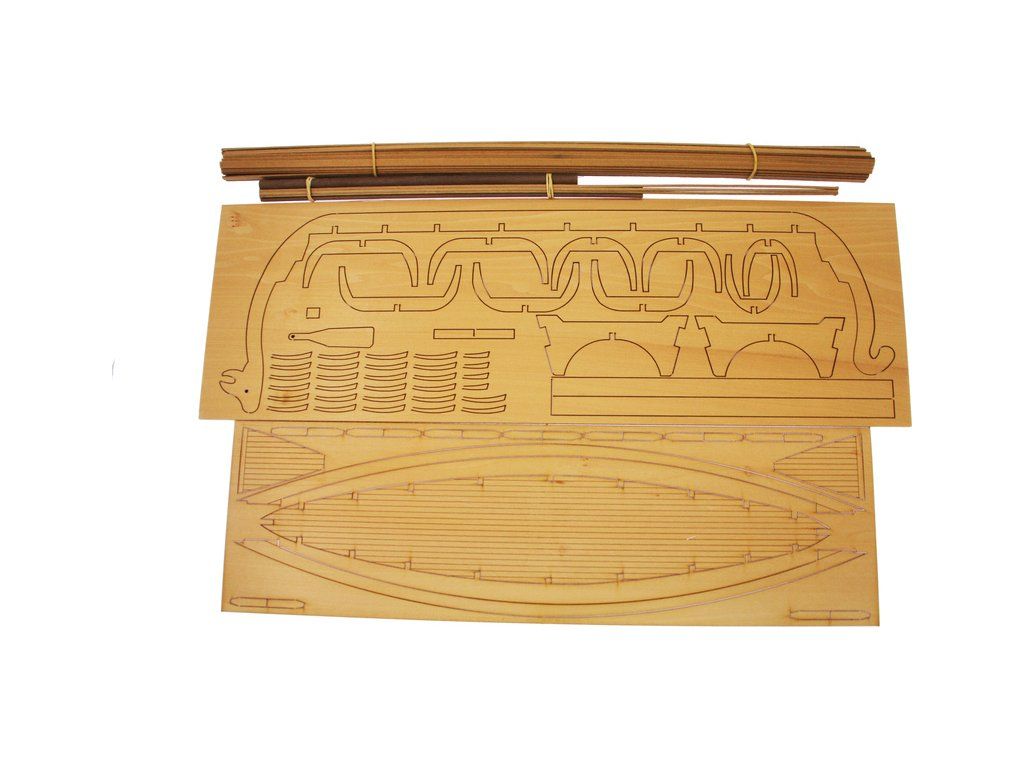 Balení obsahuje laserem řezané dřevěné díly, stěžen, ráhno, lanoví, plachtovinu a mosazné dekorace. Stavební plán.