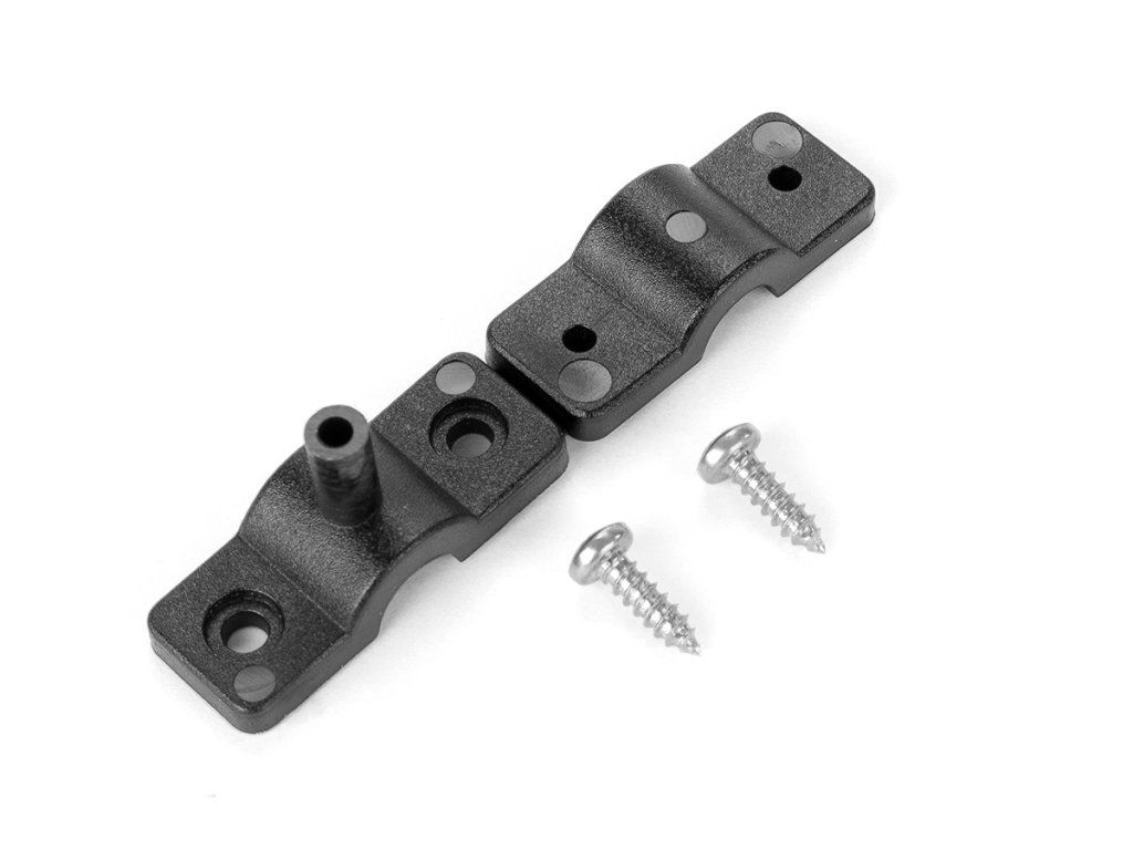 Oblý plastový podvozkový třmen pro drát průměru 2mm. Pro šrouby max. 3mm, rozteč otvorů pro šrouby 12,5mm, délka 22,5 mm.