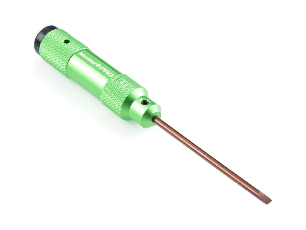 Kvalitní CNC plochý šroubovák Medial Pro o velikosti 4.0 mm má hliníkovou rukojeť o délce 97 mm, průměru 21 mm s gumovou opěrkou a dřík o délce 83 mm. Atraktivní balení v plastové krabičce.