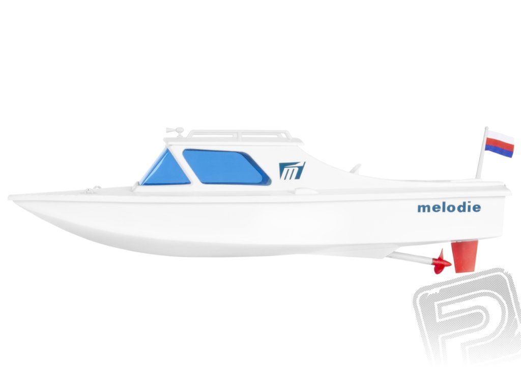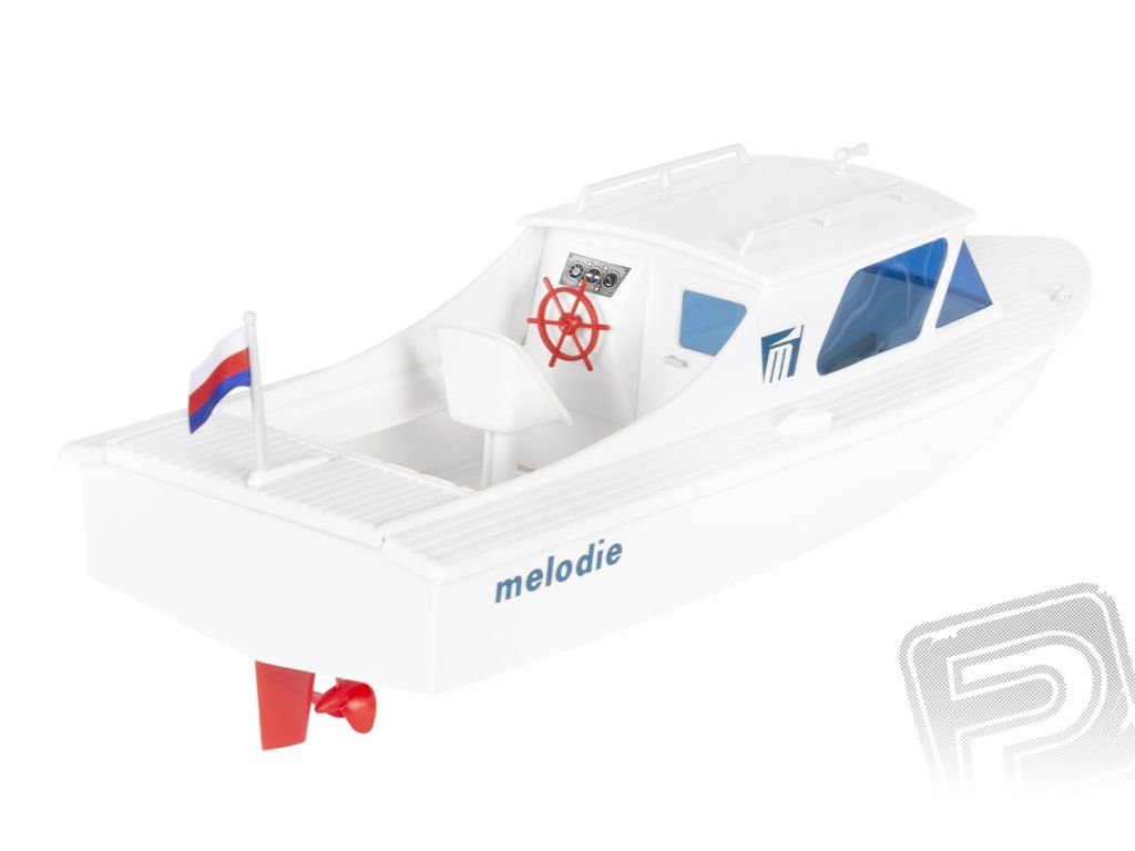 Dnešní Melodie zachovává věrně tvary své prababičky; stejně jako dříve má trup a nástavby z vakuově lisovaných plastových dílů. Stavbu urychlí nová paluba plastová paluba a další díly nahrazující překližku v původní stavebnici. Loď můžete postavit jako volně plovoucí retro model s motorem Igla 4,5 V napájeným z ploché baterie nebo ji upravit pro dálkové ovládání. A vrátit se aspoň na chvíli do dětství...