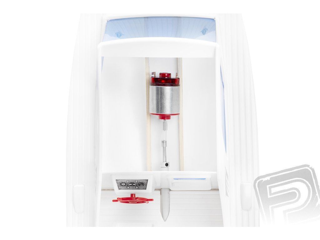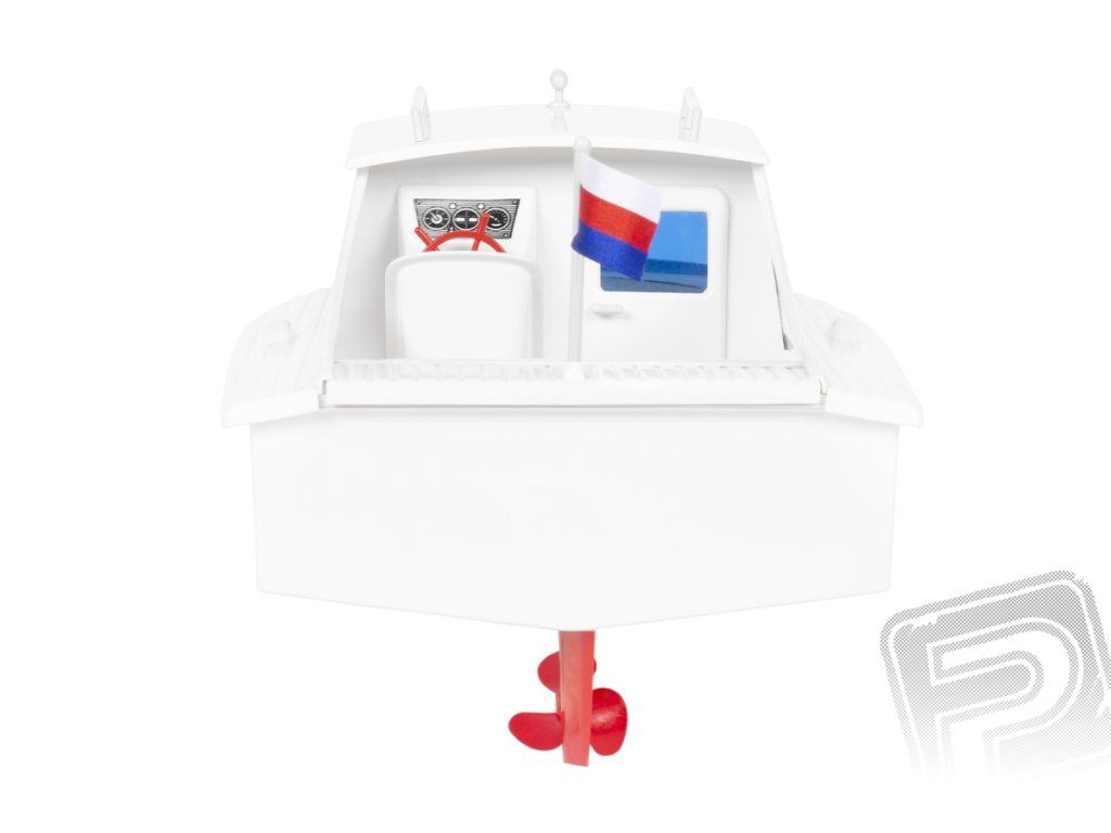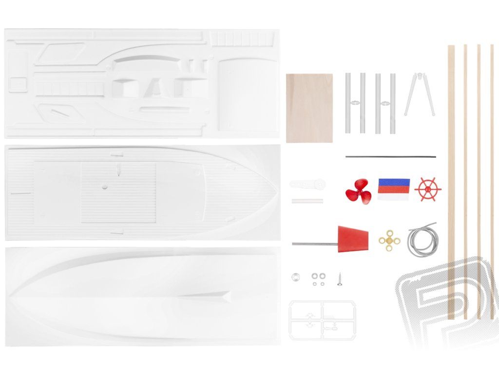 Model kabinového motorového člunu s jednoduchou konstrukcí určený pro začínající lodní stavitele.