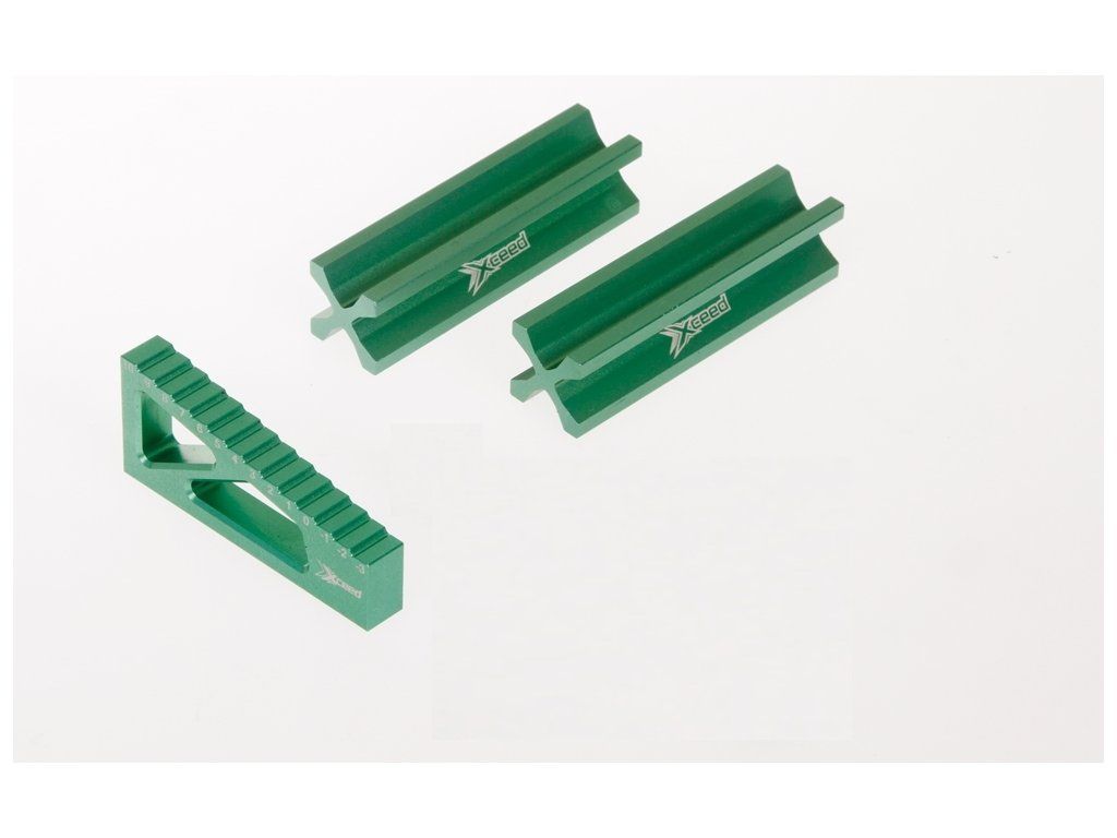 Nastavovací nástroje pro 1/10 On Road podvozky. Silné a odolné hliníkové nastavovací bloky pro použití v terénu v sadě. Tyto stojany udrží váš podvozek dobře umístěné při seřizovacích pracích na vašem autě. Jsou vysoké 20 mm a široké 80 mm ve tvaru Xceed X. Zelený eloxovaný hliník s vyrytými logy Xceed. Lehký hliníkový nástroj pro měření propadu ramen. Laserem gravírované s výškou od -3 do 10mm v krocích po 1mm. Na boku vyryté logo Xceed. Nastavovací blok (2 ks.) a měřidlo výšky jízdy jsou k dispozici samostatně a jako sada.