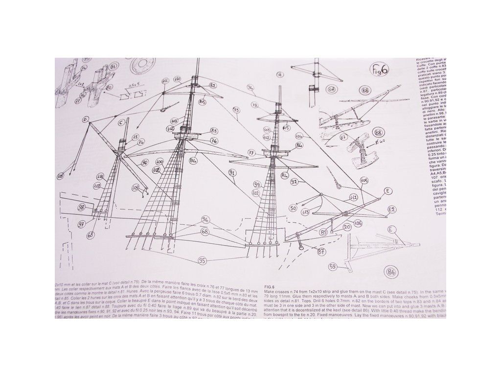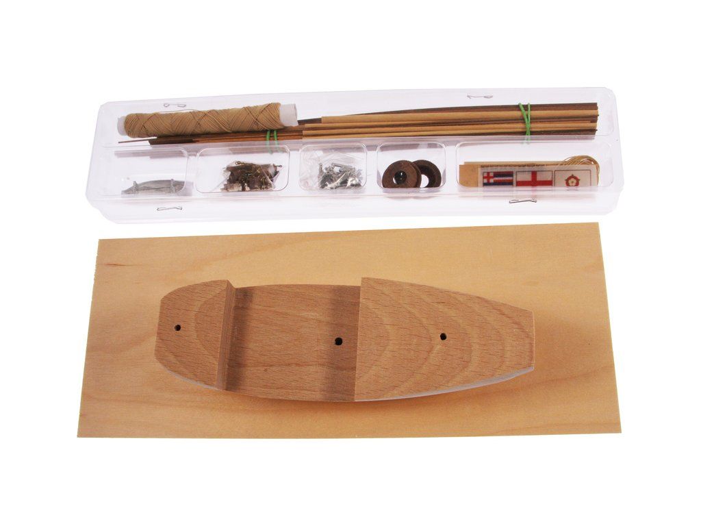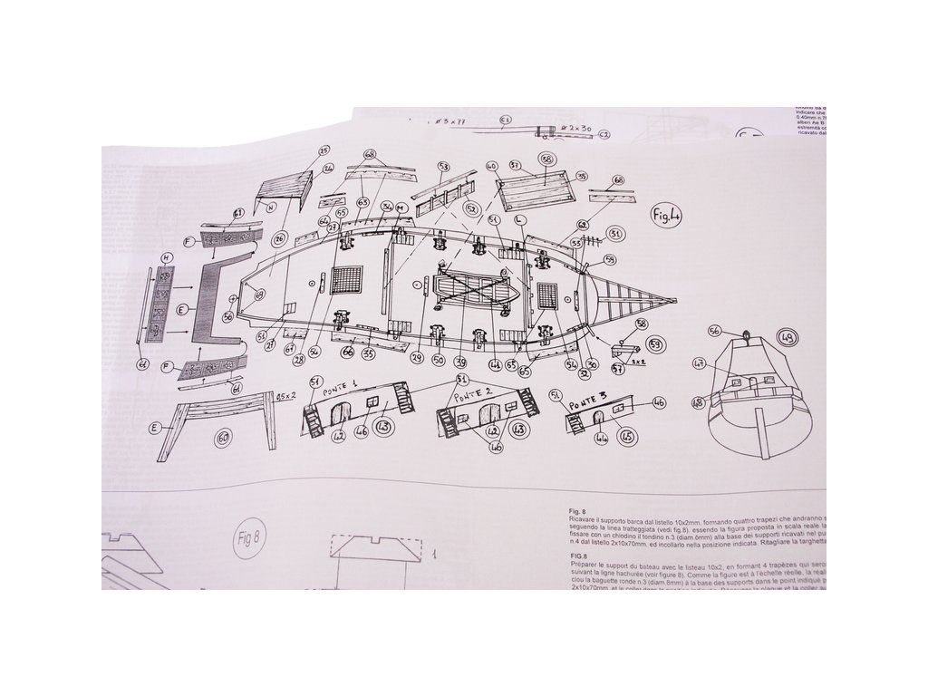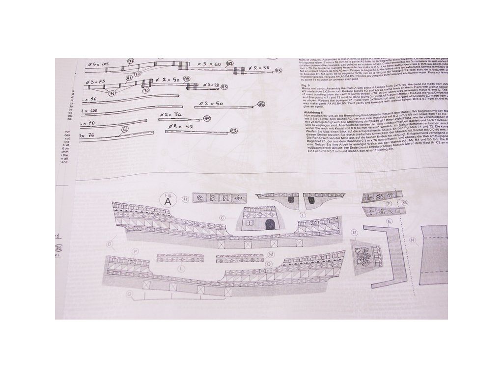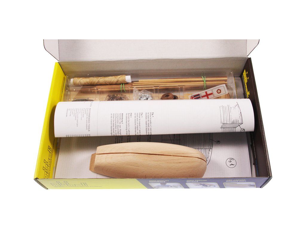 Balení obsahuje sadu překližkových dílů, sadu dřevěných lišt o různém průřezu, blistr s drobnými díly, sadu výkresů a manuál anglický, německý, francouzský a italský.