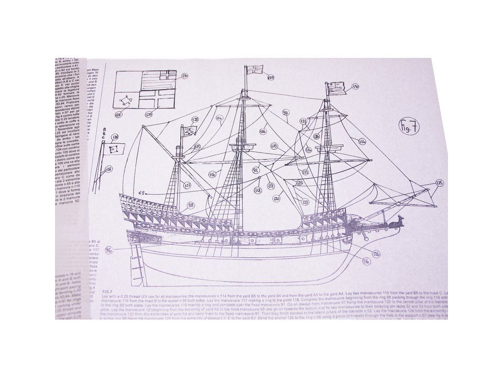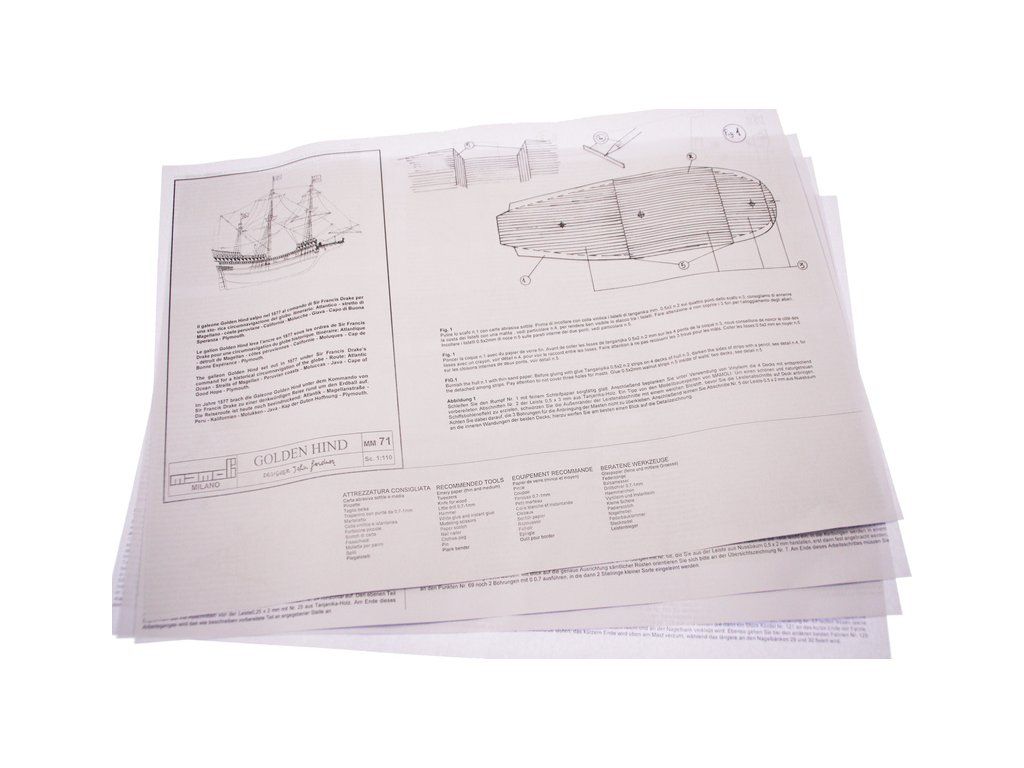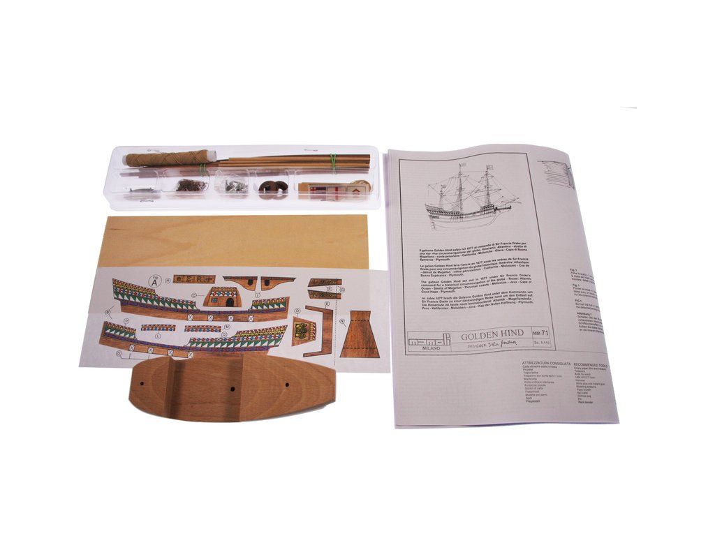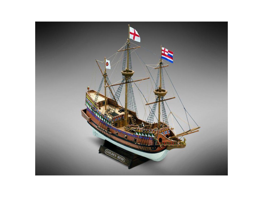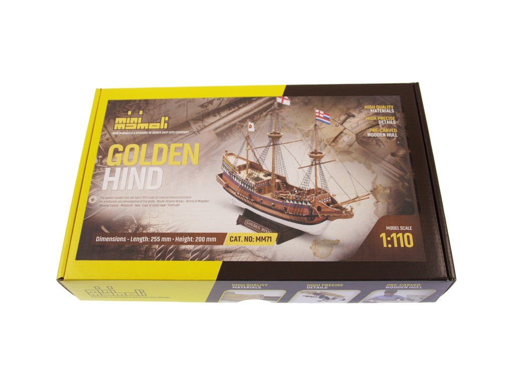 Model lodi Golden Hind, z řady Mini Mamoli, v měřítku 1:110. Golden Hind (Zlatá laň) byla vlajkovou lodí Francise Drakea, na níž obeplul v letech 1577–1580 zeměkouli. Stavebnice obsahuje vyřezané dřevění díly, kovové díly, stojánek a návod.