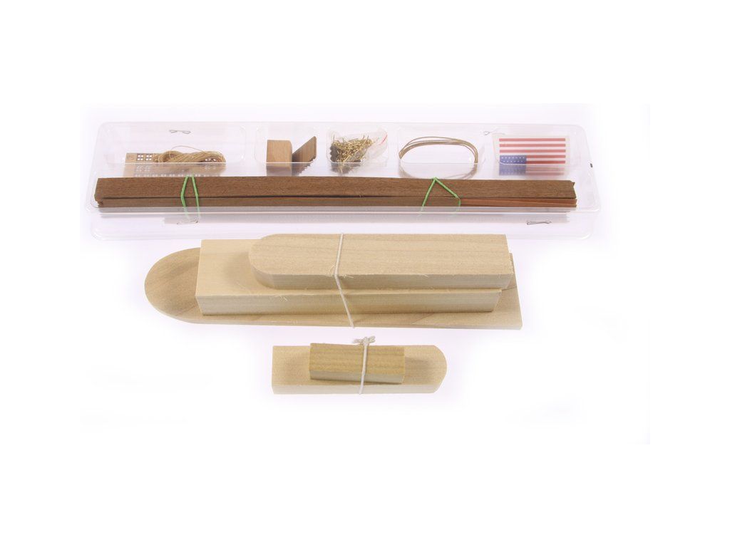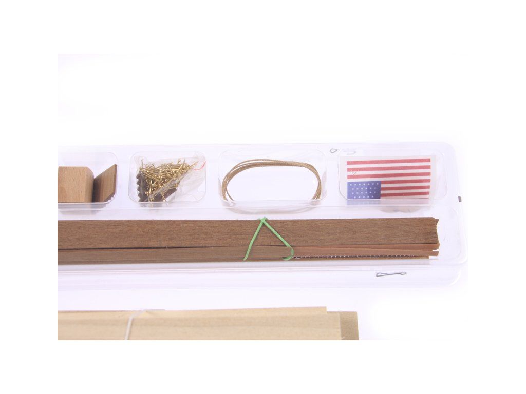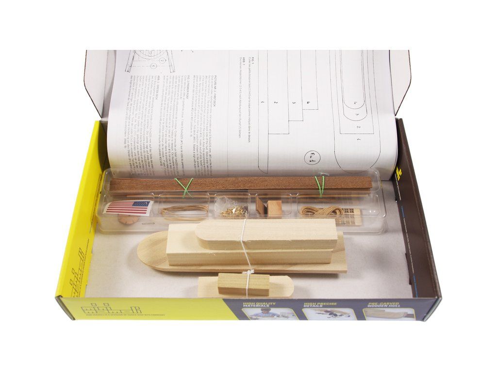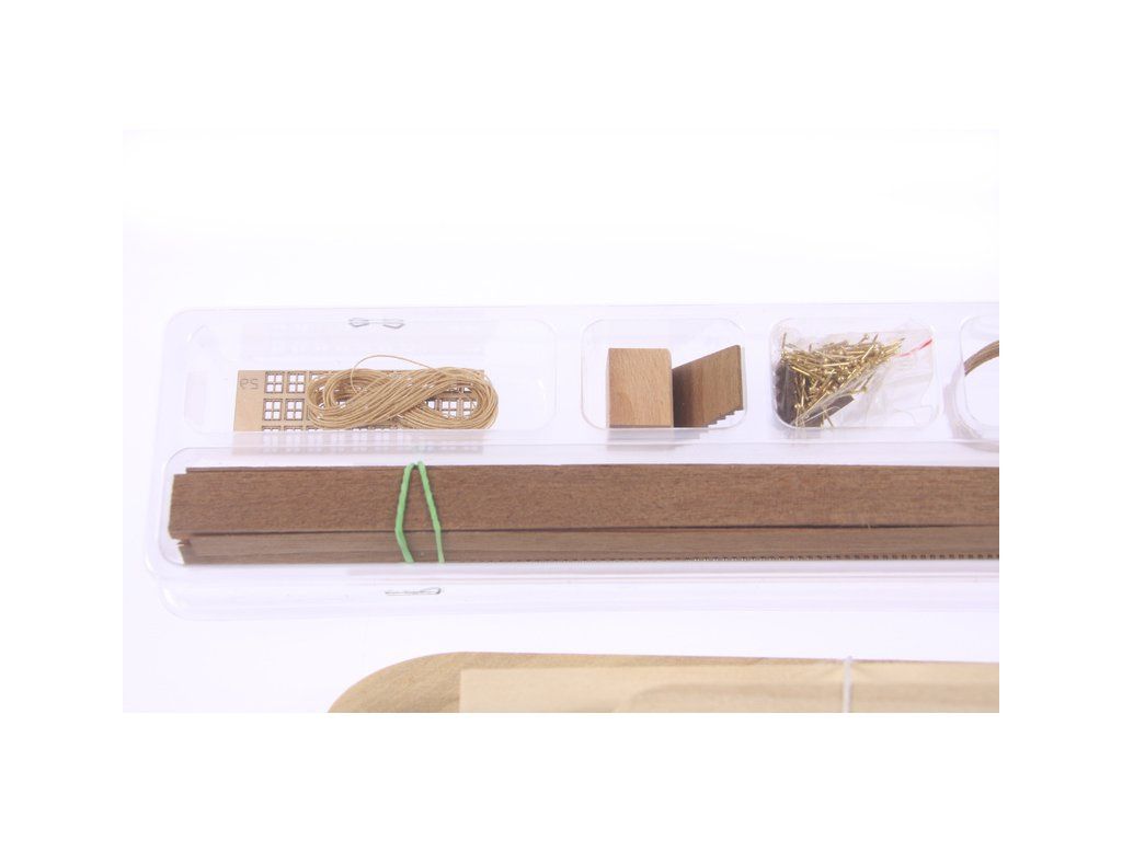 Balení obsahuje hotový polotovar trupu, překližkové díly, dřevěné lišty, blistr s drobnými díly, sadu výkresů a návod anglický, německý, francouzský a italský.