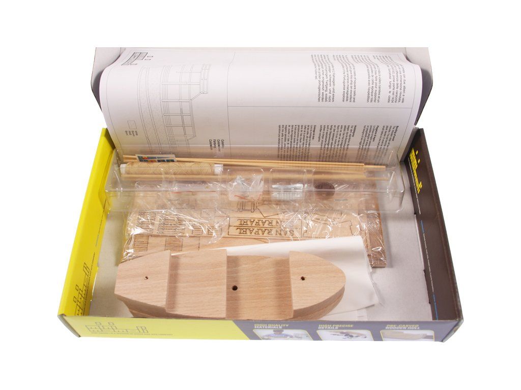Model lodi San Rafael, z řady Mini Mamoli, v měřítku 1:115, Model vhodný pro začínající modeláře. Stavebnice obsahuje vyřezané dřevění díly, kovové díly, stojánek a návod.