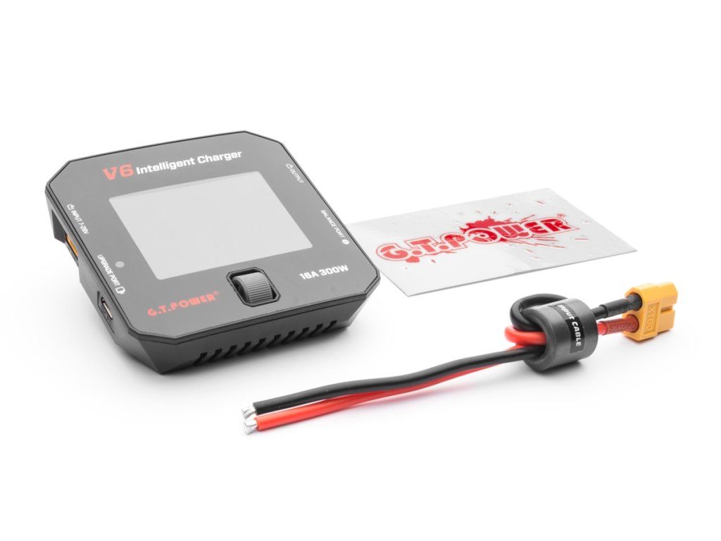 Nabíječ G.T. POWER V6 300W byl konstruován se snahou nabídnout inteligentní kapesní nabíječ s velkým výkonem a velmi jednoduchou a přehlednou obsluhou. V6 umožňuje nabíjet a vybíjet běžné typy článků (NiCd, NiMH, LiPo, LiHV, Li-ion, LiFe, Pb), navíc je vybaven vestavěným šestikanálovým balancerem, který zajišťuje velmi bezpečné a komfortní nabíjení lithiových akumulátorů.