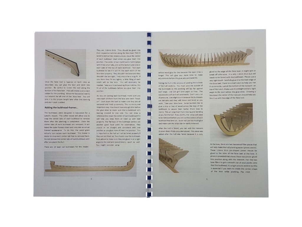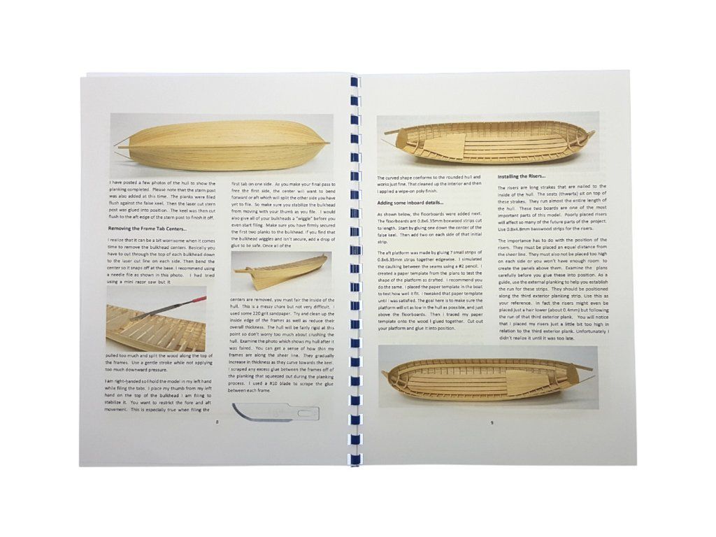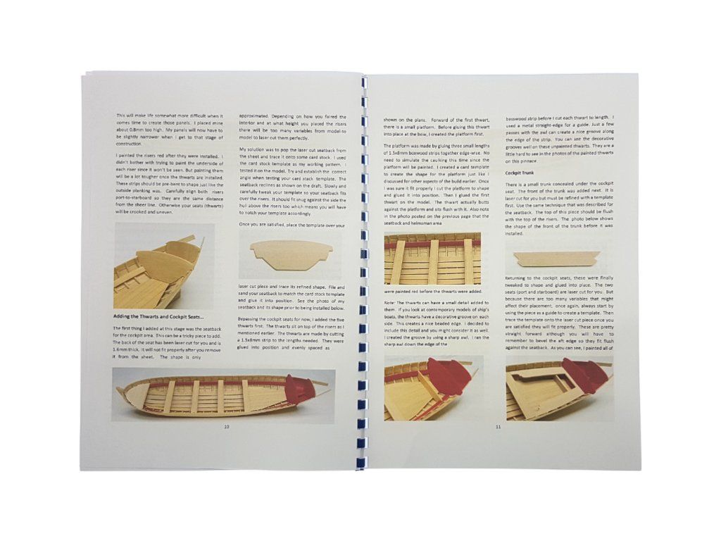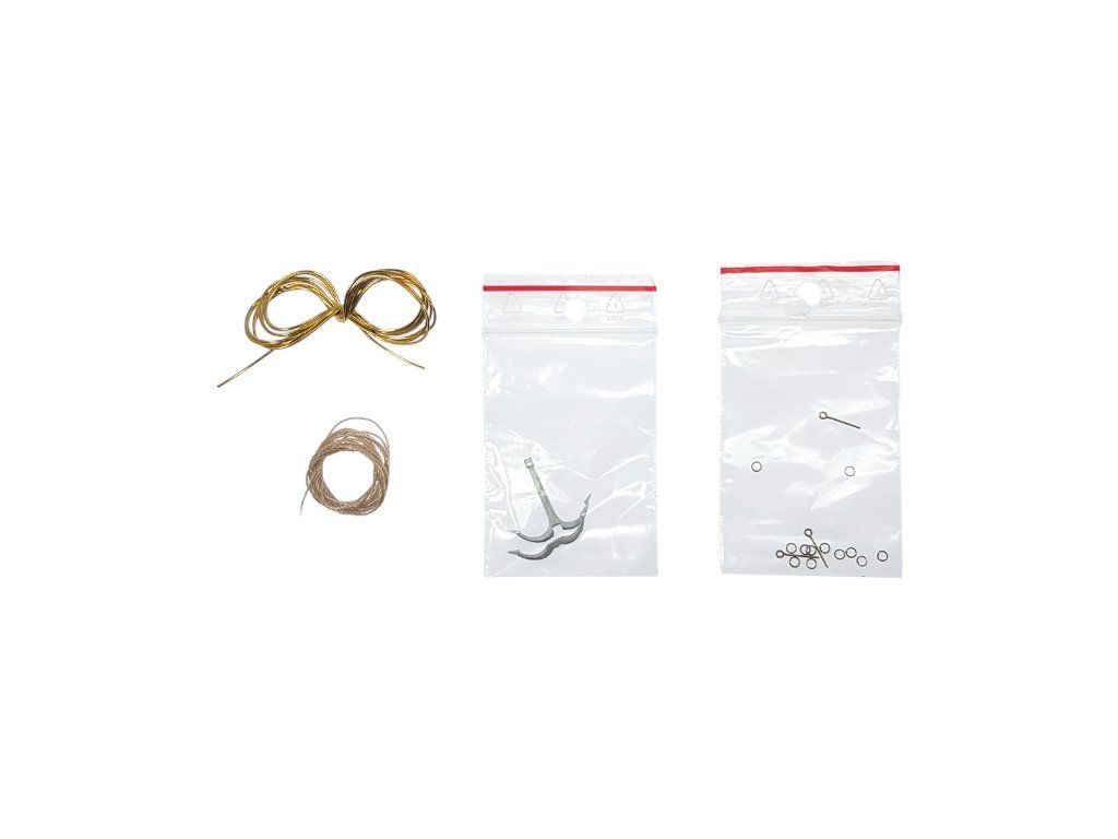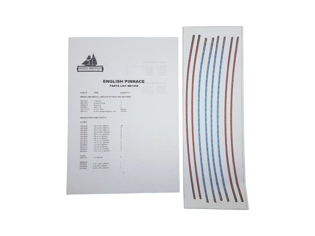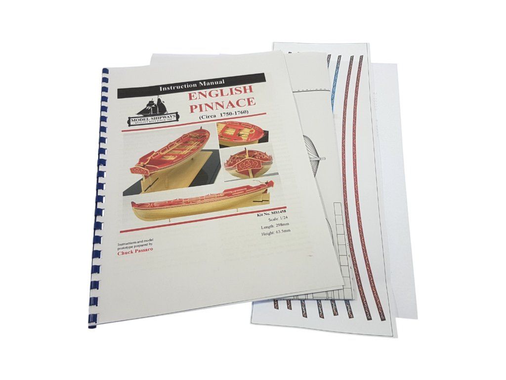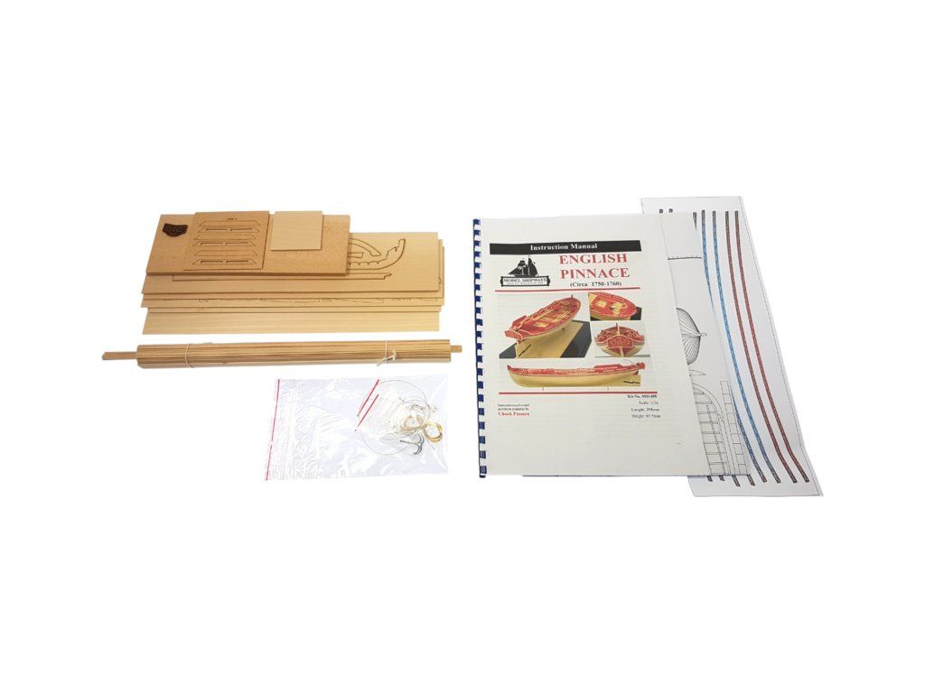 Součástí balení stavebnice statického modelu lodi Model Shipways English Pinnace 1:24 , je sada výkresů modelu, manuál, sada překližkových laserem řezaných dílů, lišty, mosazný drát, oka, lano, odlitek kotvy, apod.
