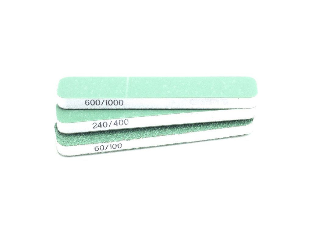 V balení jsou 3 ks flexibilních oboustranných brousítek 90 x 19 x 6 mm, na každé straně jinou hrubostí - hrubé P60/P100, střední P240/P400 a jemné P600/P1000. Tvarem se přizpůsobí i zaobleným plochám.