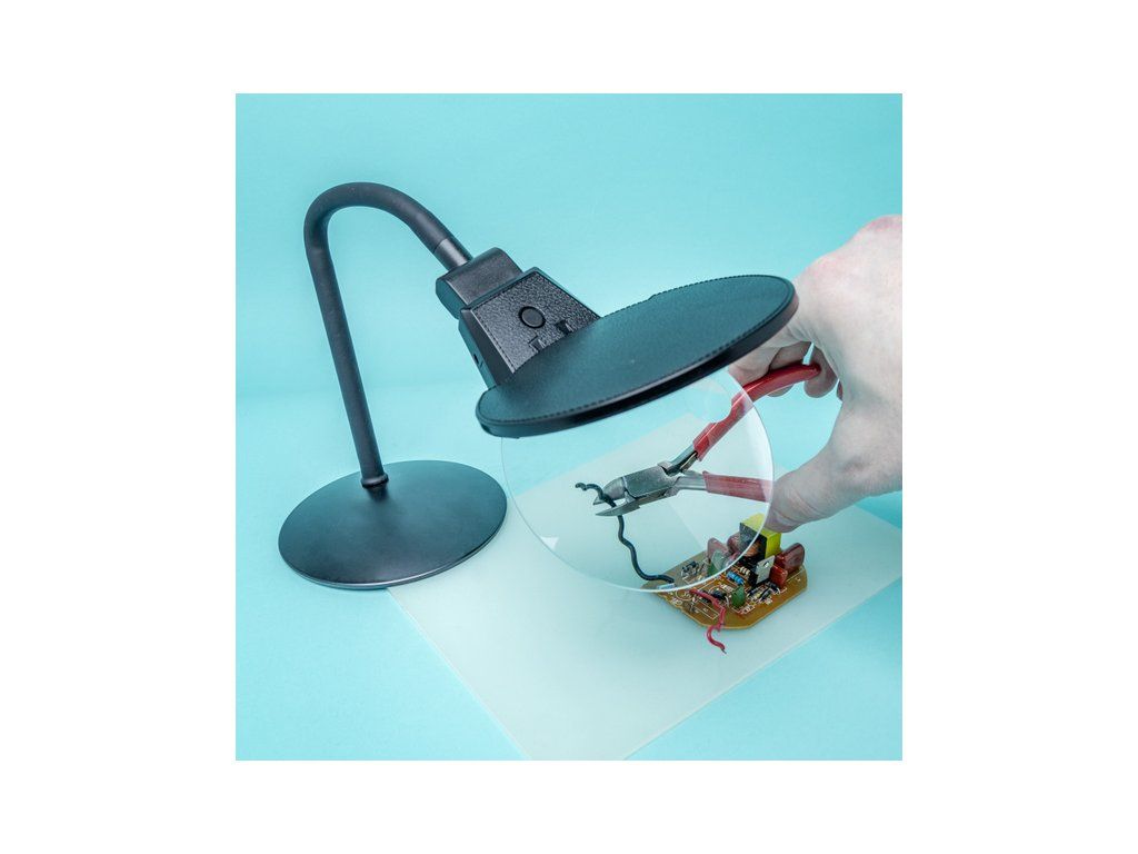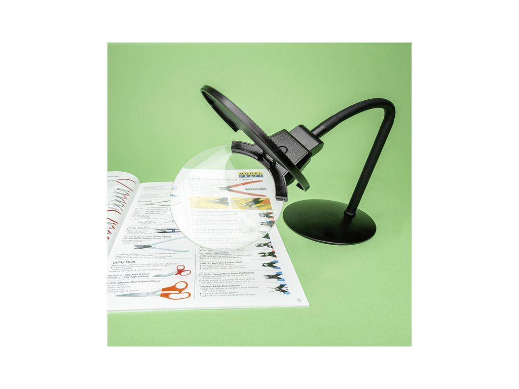 Modelcraft přenosná stolní lupa 1.75x/4.5x s flexibilním krkem na masívní stabilní základně. Odklopný kryt lupy o průměru čočky 110mm, zvětšení 3 dioptrie, vsazená lupa 14 dioptrií.