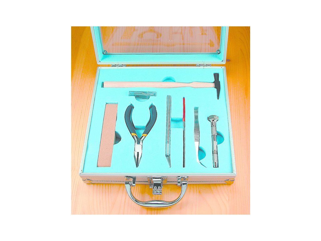Modelcraft nářadí pro lodní modeláře (sada 12ks). Dodává se v atraktivním hliníkovém kufru 240mm x 235mm x 60mm. Hmotnost 691g. Obsahuje mini kleště, řezací nůž, 5x11 čepelí, brusný blok, diamantový plochý pilník, kladívko, zahnutou pinzetu a Modelcraft mini ruční vrtačku.
