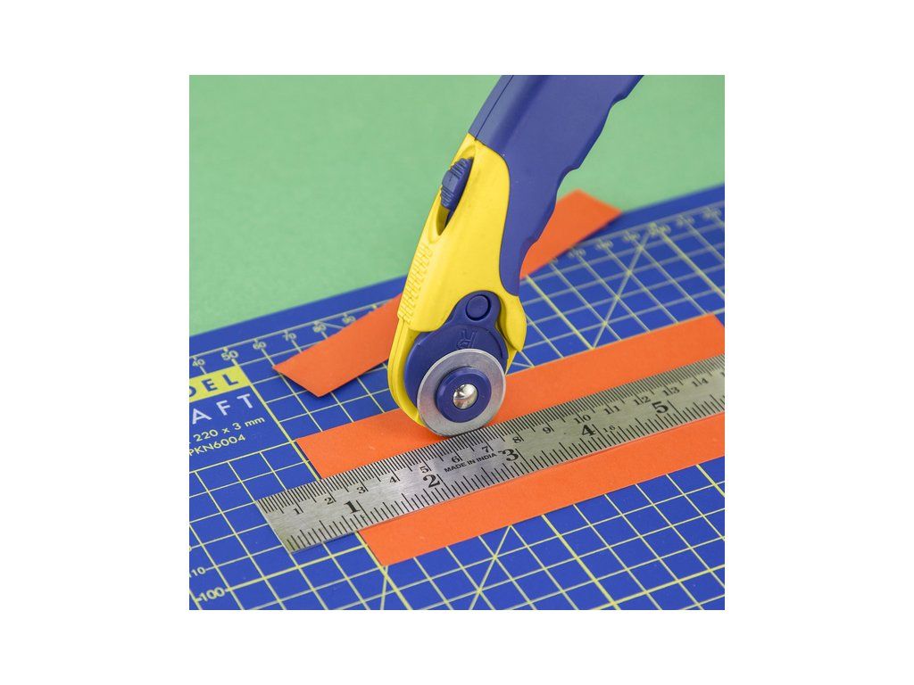 Modelcraft rotační nůž 45mm, 3ks řezací kolečka je sada pro pohodlné řezání tkaniny, kartonu, papíru, kůže, vinilu apod. K dispozici jsou náhradní kolečka s různými tvary jako Standard, Přerušovaný a Vlnitý. Robusní rukojeť pro pevné držení a silný přítlak. Rozměry 170mm x 58mm x 23mm, hmotnost 89g.