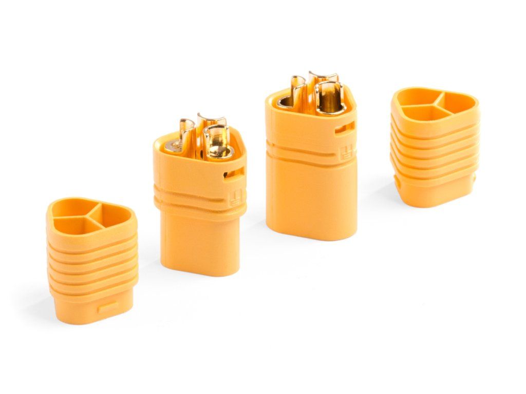 Tříkolíkový silový konektor se zlacenými kontakty se zatížitelností max. 60 A. Pro kabely o průřezu max. 3,3 mm2 (12AWG). Přechodový odpor 0,55 mOhm, max. 500 V. Ideální pro propojování střídavých elektromotorů a regulátorů. Balení 5 párů.Doplňkové parametry