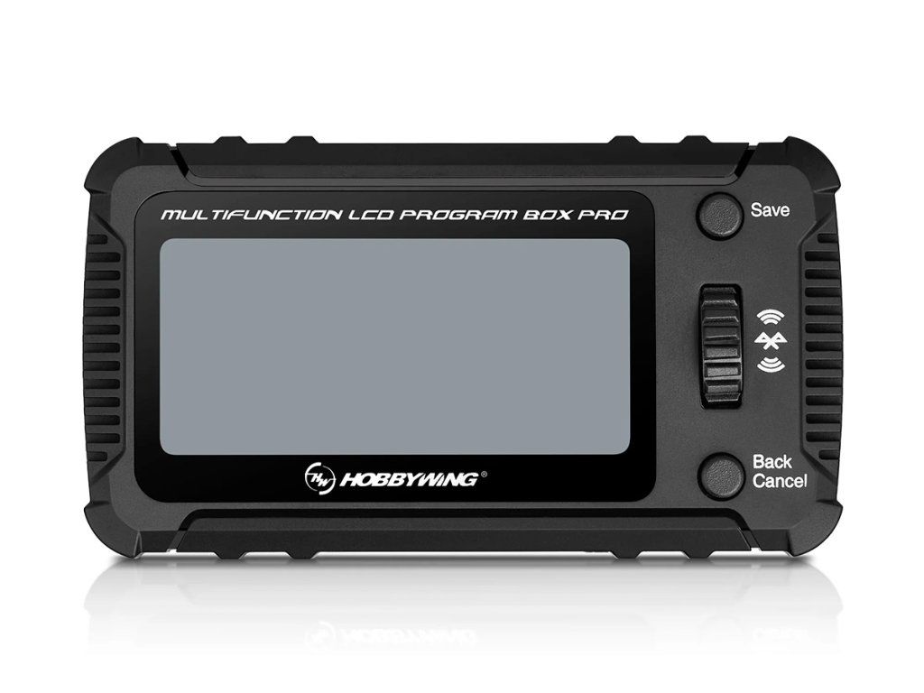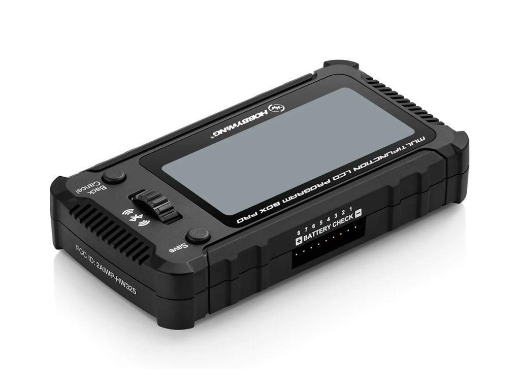 Multifunkční LCD programovací box PRO pro regulátory vybraných řad Hobbywing pro auta, letadla a lodě slouží ke snadnému a rychlému programování regulátorů - doma „na stole" stejně jako na letišti. Kromě toho může sloužit jako USB rozhraní pro připojení regulátoru k PC pro jeho programování pomocí programu USB Link a aktualizaci firmwaru nebo jako Bluetooth OTA modul dovolující nastavování, aktualizaci firmwaru a načtení provozních dat zaznamenaných v regulátoru pomocí mobilní aplikace (iOS i Android). Vybaven je také vstupem umožňujícím měřit celkové napětí a napětí jednotlivých článků LiPo akumulátorových sad 2-8S.