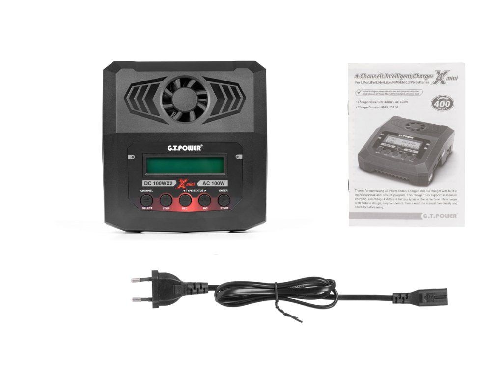 Dvoukanálový nabíječ G.T. POWER X2 mini 2x100W byl konstruován se snahou poskytnout vše potřebné pro nabíjení dvou akumulátorů současně "pod jednou střechou" včetně síťového zdroje a s jednoduchou obsluhou.