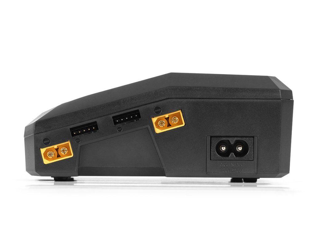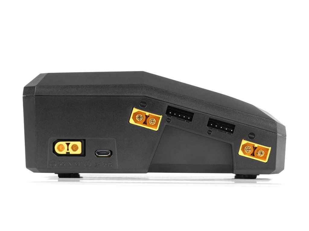 Nabíječ je ve všech kanálech vybaven výstupními zásuvkami XT60 a univerzálními zásuvkami pro servisní konektory JST-XH umožňující přímo zapojit silové kabely akumulátoru a servisní konektory JST-XH sad 2-4S – pokud používáte sady s konektory XT60 a JST-XH, obejdete se zcela bez nabíjecích kabelů a adaptérů.