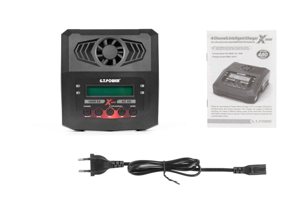 Čtyřkanálový nabíječ G.T. POWER X4 mini 4x100W byl konstruován se snahou poskytnout vše potřebné pro nabíjení až čtyř akumulátorů současně "pod jednou střechou" včetně síťového zdroje a s jednoduchou obsluhou.