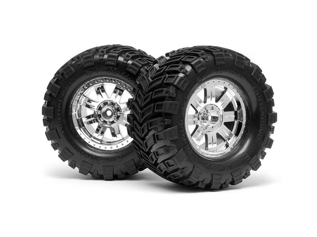 Nalepené Super Mudders gumy 155x85mm na chromových diskách, 2ks. pro Savage