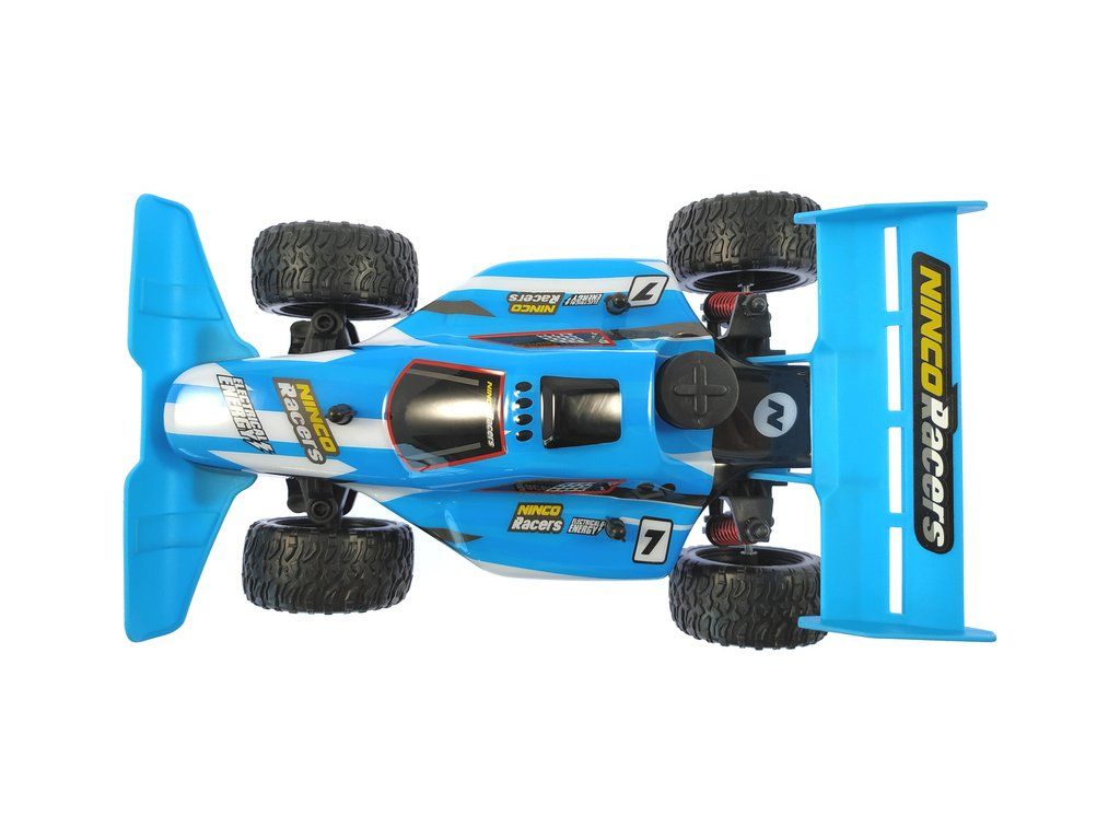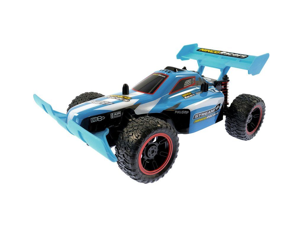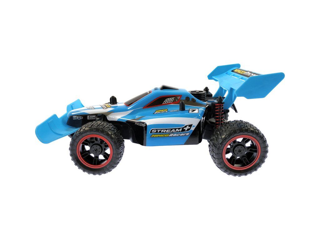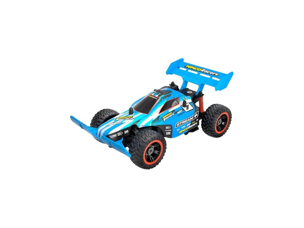 Auto na dálkové ovládání Ninco Stream+ v měříku 1:18 v provedení Buggy. Auto je dlouhé 26,5 cm a dosáhne rychlosti až 15 km/h. Modrá karoserie s motivem proudu řeky. Zadní přítlačné křídlo. Pohon zadních kol. Velké terénní pneumatiky. Volantový vysílač 2,4GHz. Model je na tužkové baterie.