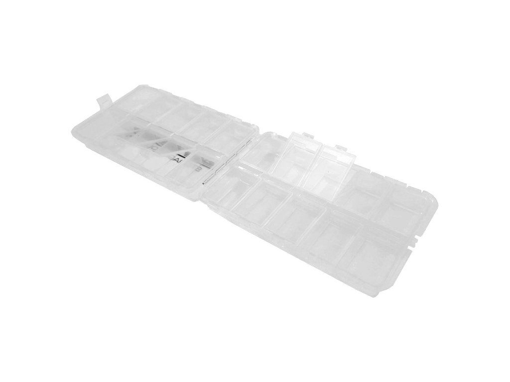 Má 20 pevných přihrádek o rozměrech 40 x 25 x 15 mm s nezávisle uzavíratelnými víky pro rychlé a snadné uložení. Navíc se box skládá na polovinu, aby byl kompaktnější.
