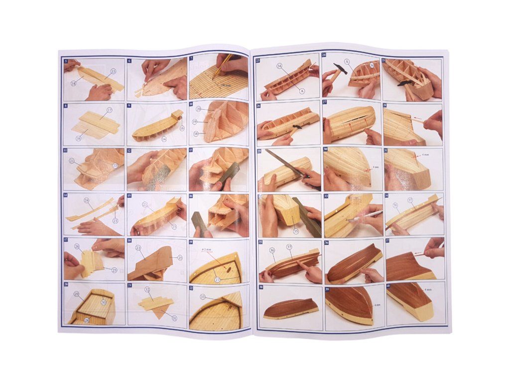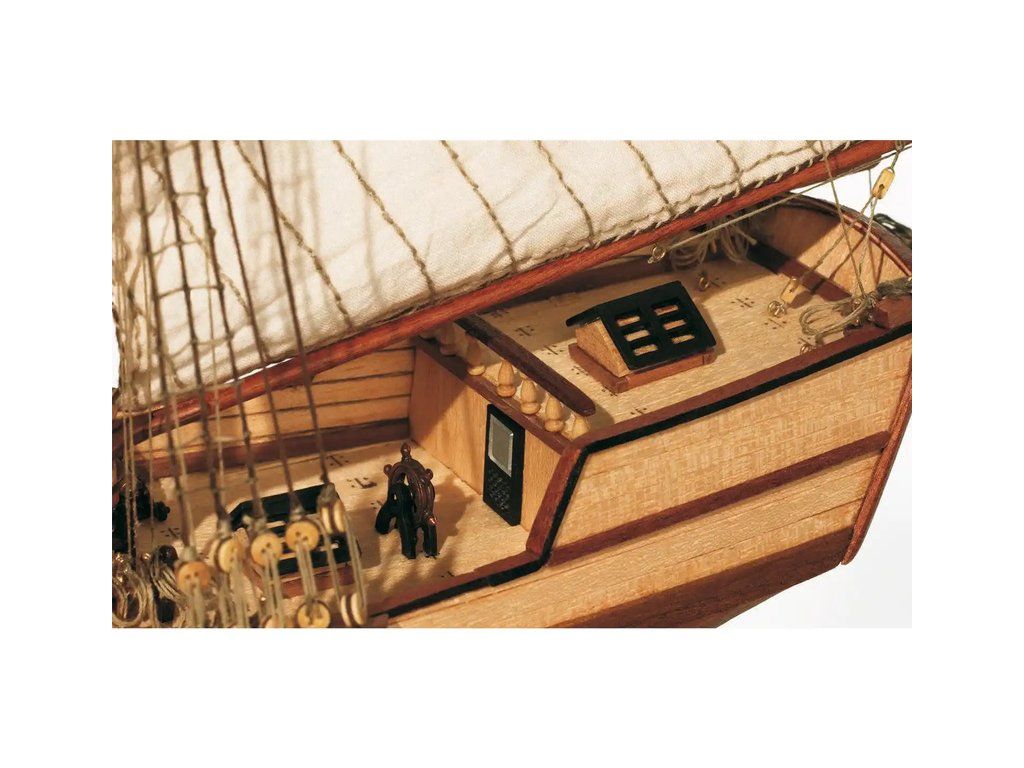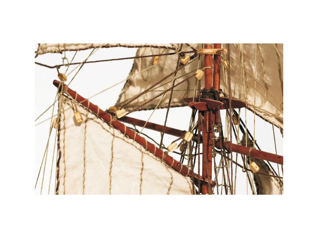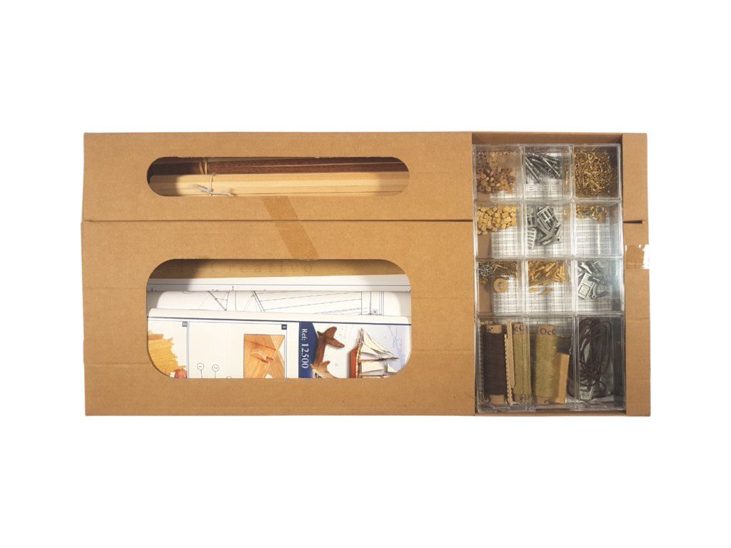 Balení obsahuje laserem řezané dřevěné díly, plaňky, palubu, stožáry, dřevěné díly, kovové odlitky, mosazné díly, lanoví, ušité plachty, stojánek. Návod a stavební plány.