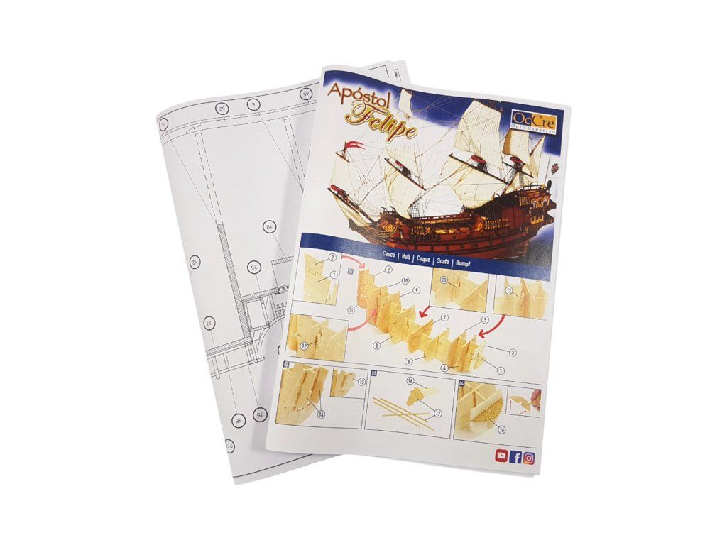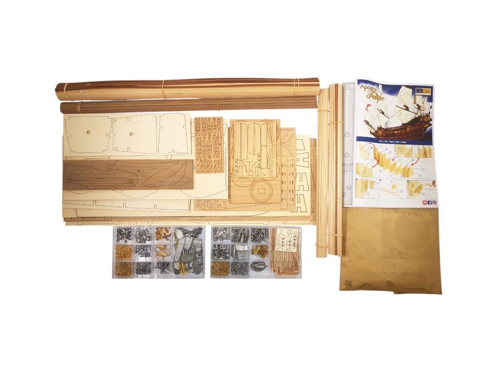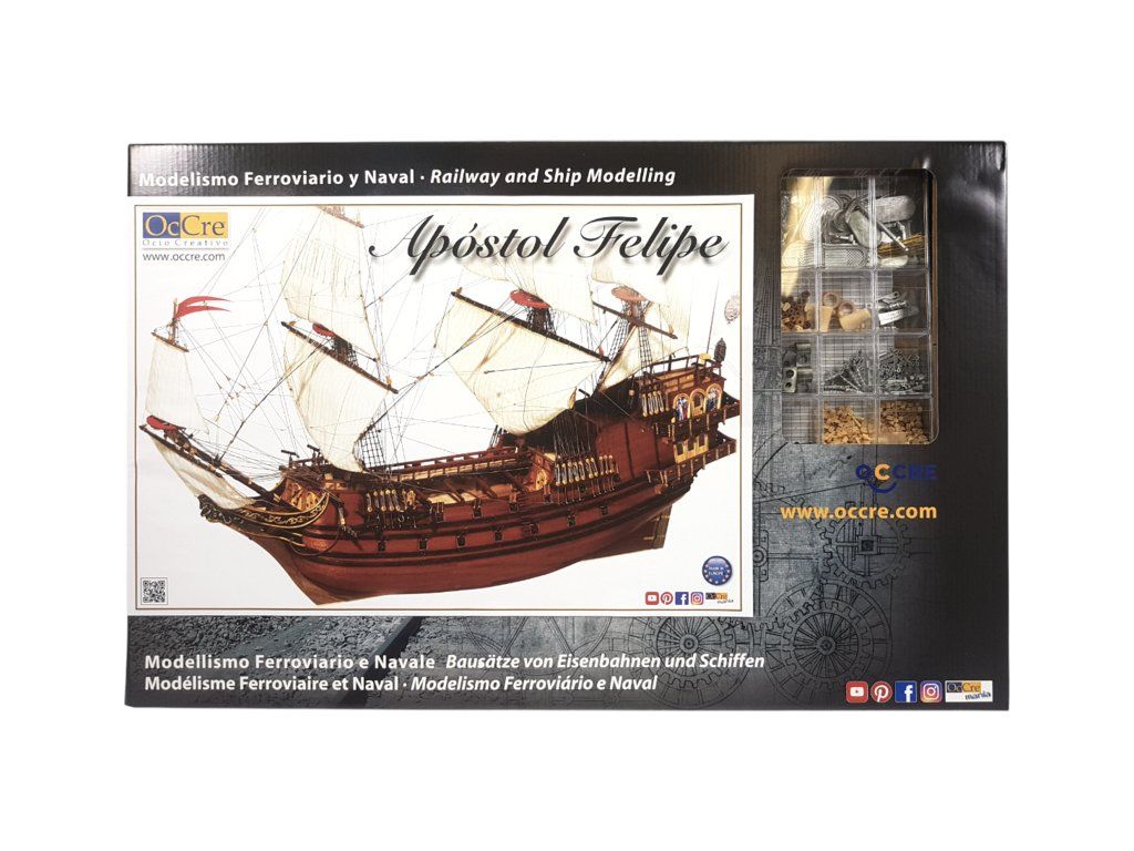 Stavebnice neplovoucího modelu lodi Apostol Felipe od značky OCCRE v měřítku 1:60. Galeona postavená pro Krále Filipa IV., jako model pro mírně pokročilé modeláře. Stavba převážně ze dřeva, laserem řezané díly, kovové odlitky, lanoví, plachty. Výhodou je špičkové balení, obrázkový návod, sada výkresů.