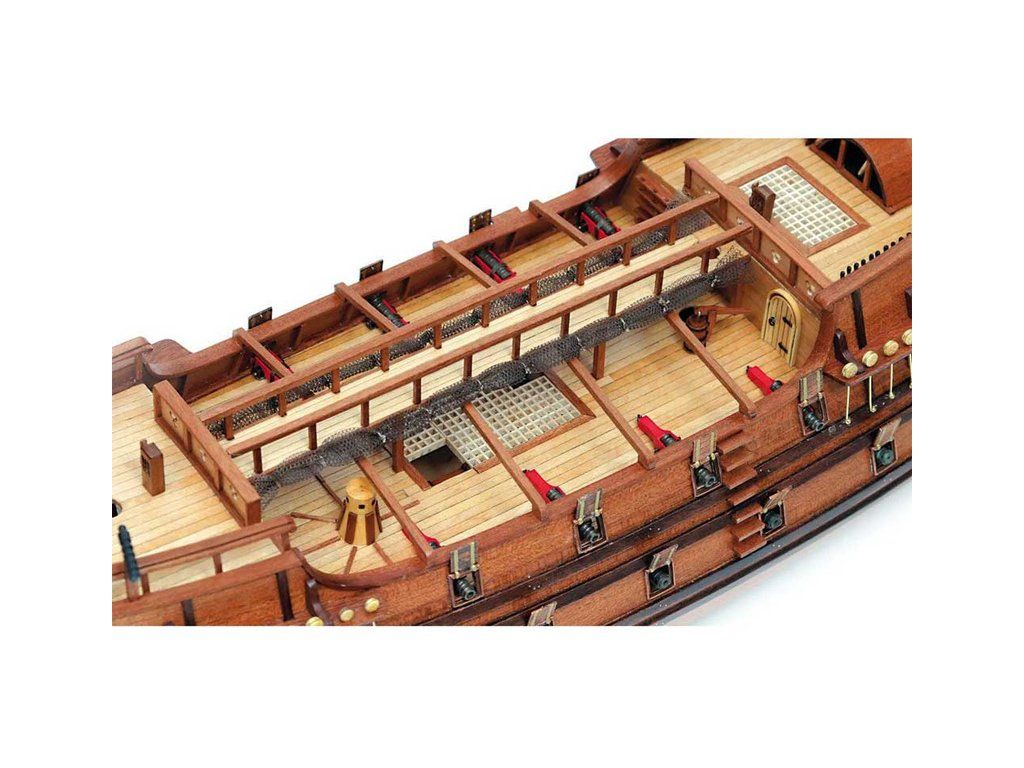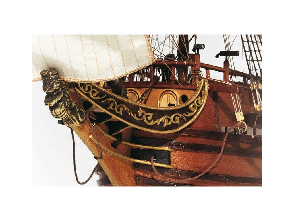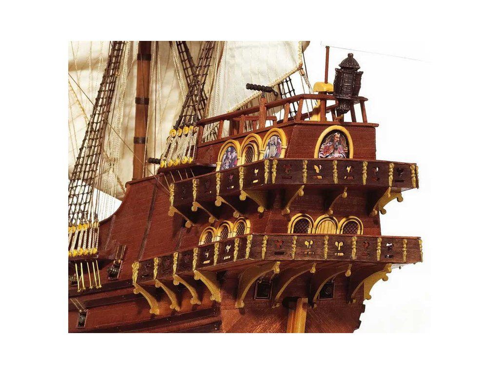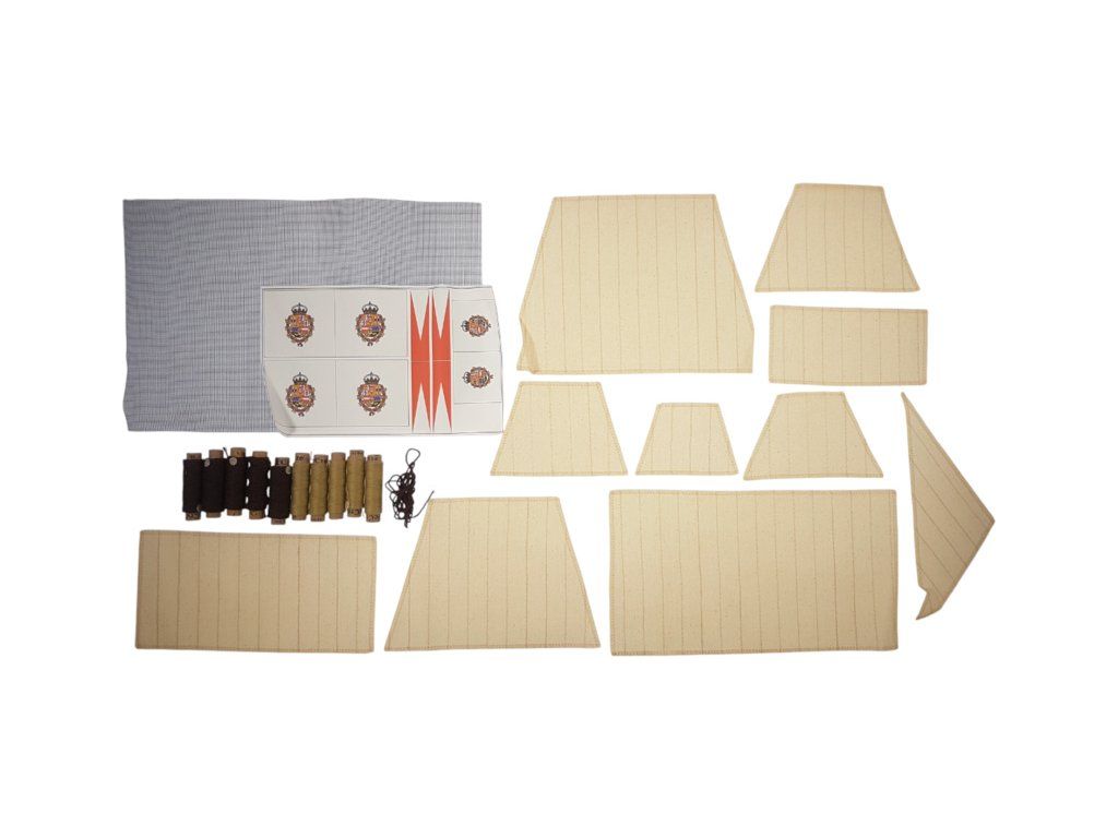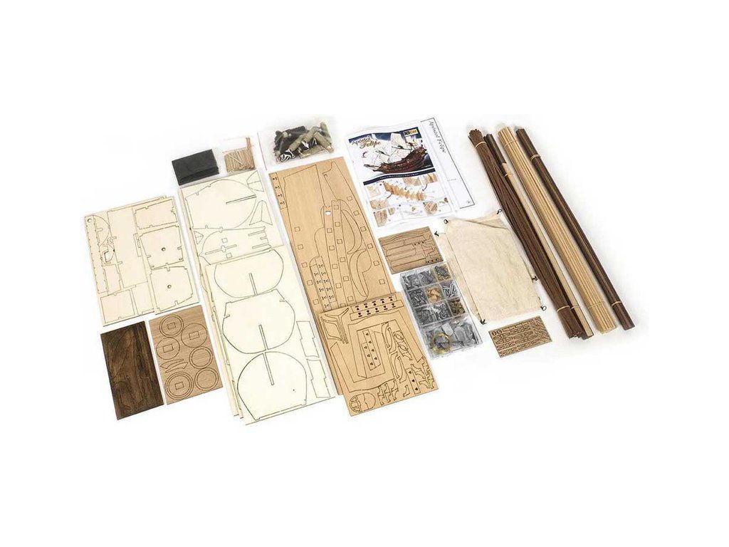 Balení obsahuje laserem řezané dřevěné díly, plaňky, palubu, stožáry, dřevěné díly, kovové odlitky, mosazné díly, lanoví, ušité plachty, vlajky. Návod a stavební výkresy.