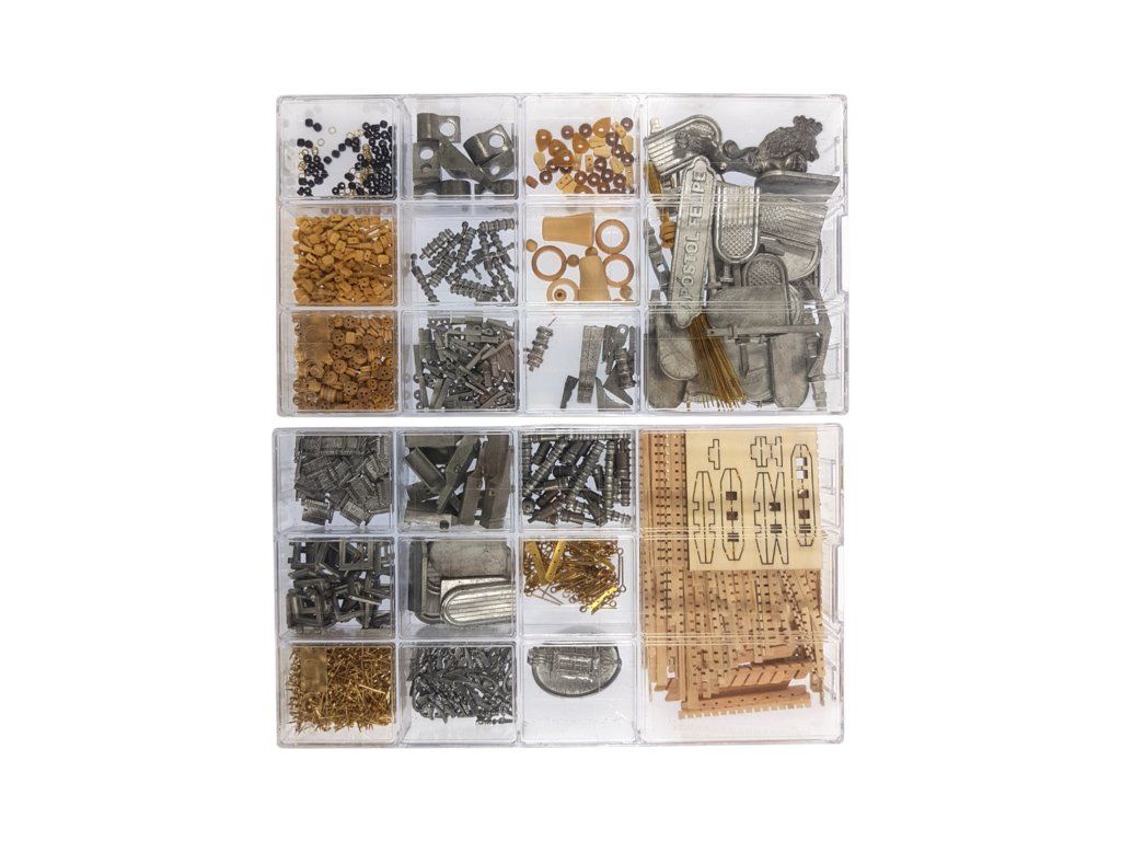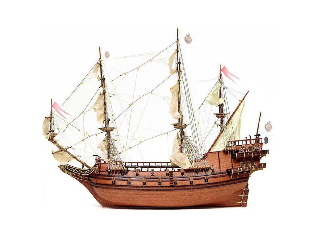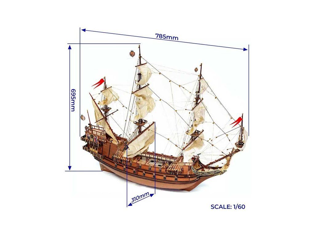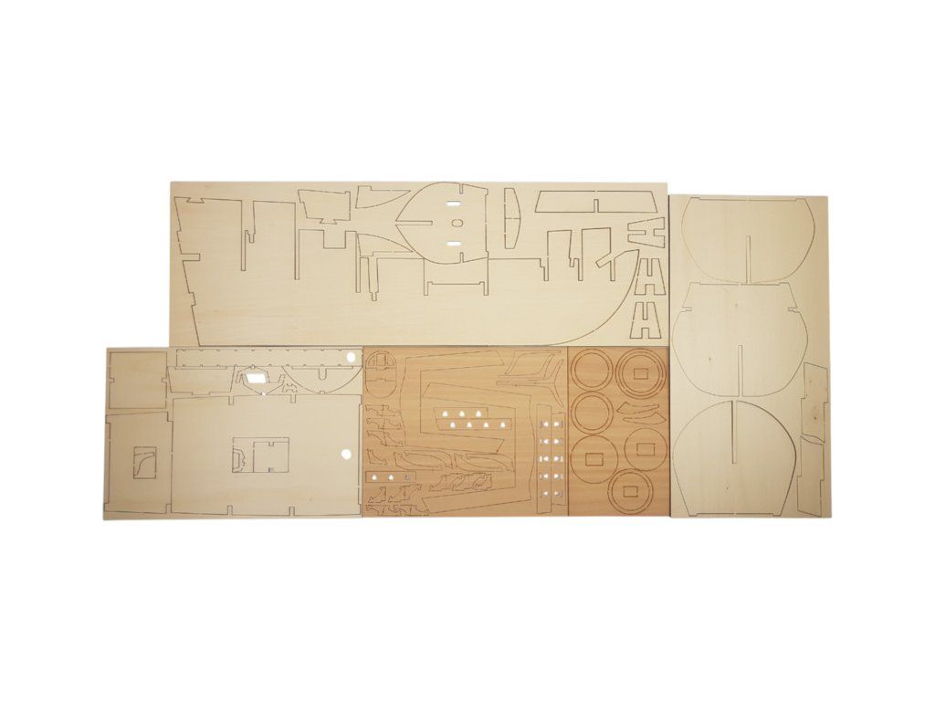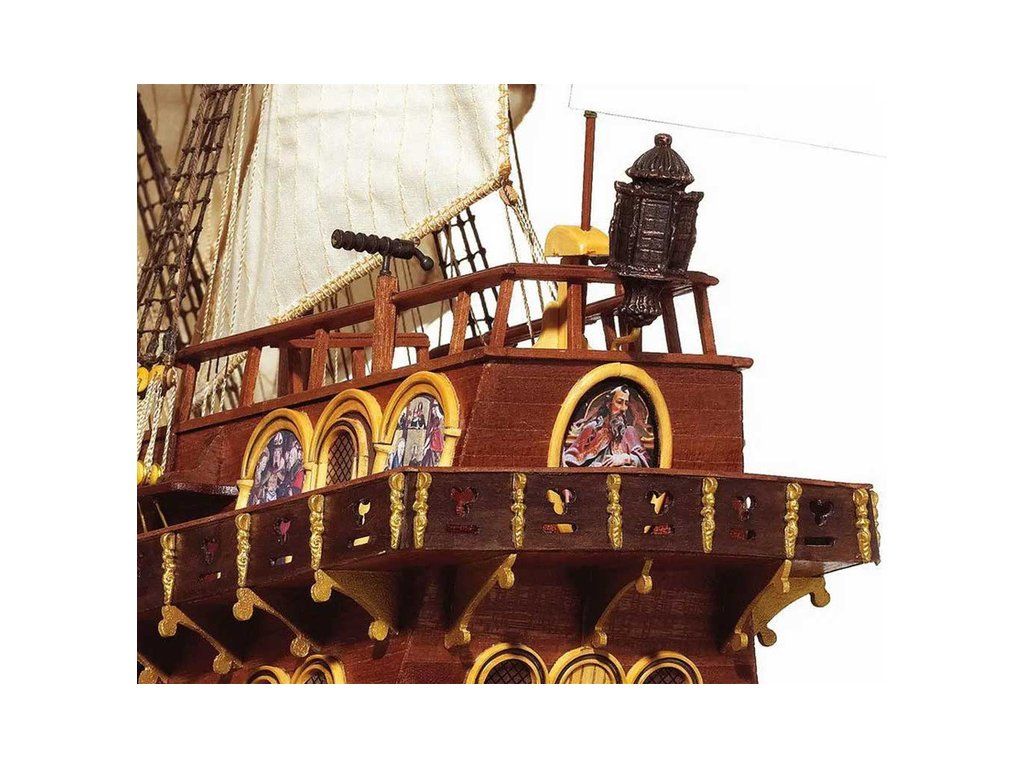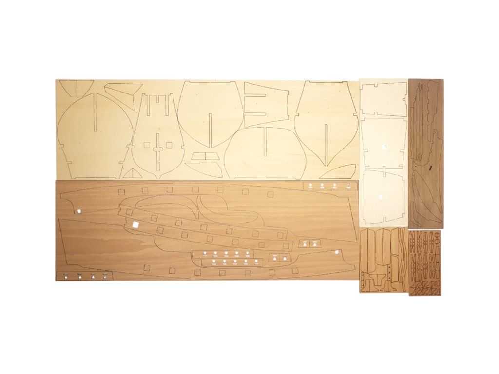 Balení obsahuje laserem řezané dřevěné díly, plaňky, palubu, stožáry, dřevěné díly, kovové odlitky, mosazné díly, lanoví, ušité plachty, vlajky. Návod a stavební výkresy.