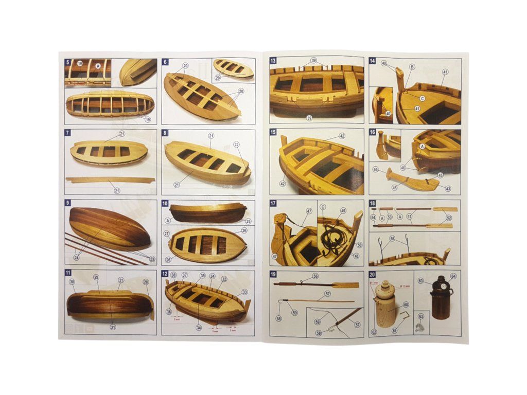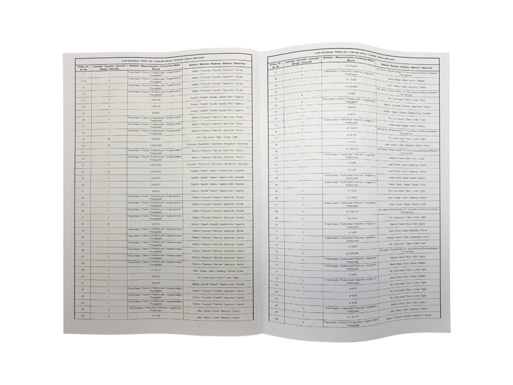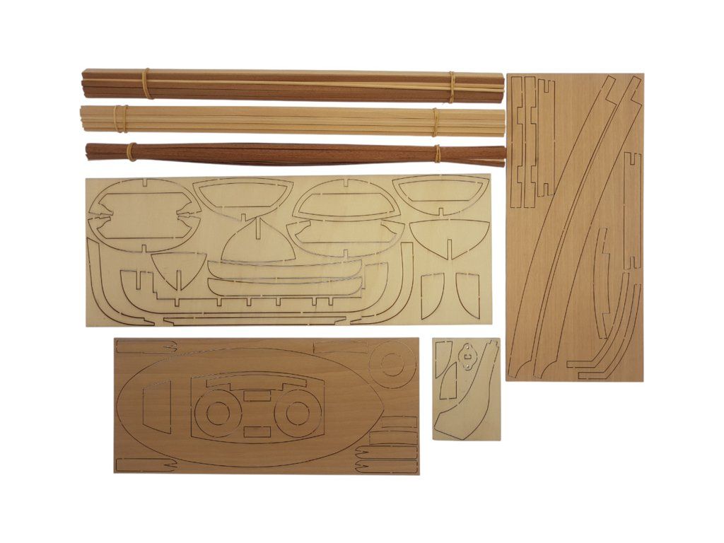Balení obsahuje laserem řezané dřevěné díly, plaňky, frézované dřevěné díly, kovové odlitky, mosazné díly, lana. Návod a stavební výkresy.