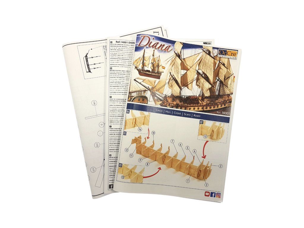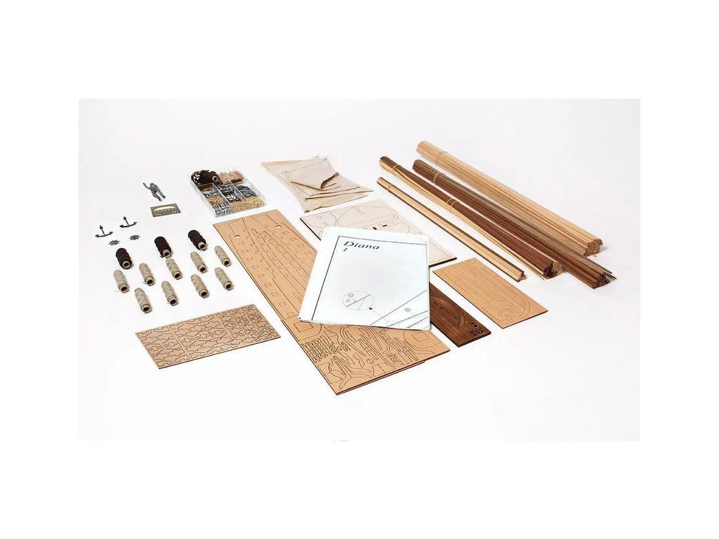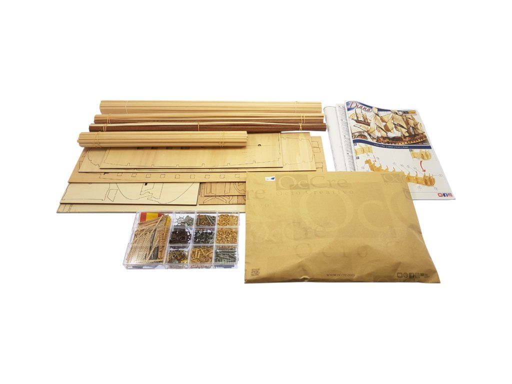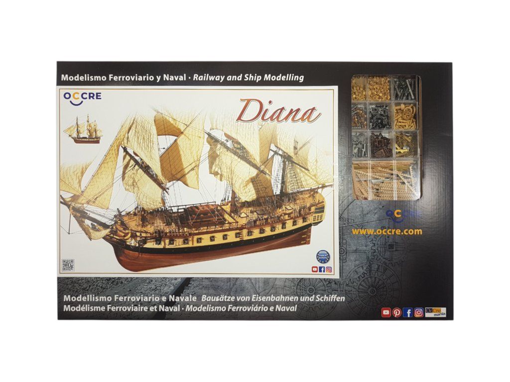 Stavebnice neplovoucího modelu lodi Diana od značky OCCRE v měřítku 1:85. Španělská válečná fregata se silnou výzbrojí, sloužící v boji proti revoluční Francii a později proti Británii. Stavba převážně ze dřeva, laserem řezané díly, kovové odlitky, lanoví, plachty. Výhodou je špičkové balení, obrázkový návod, sada výkresů.