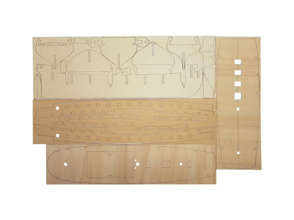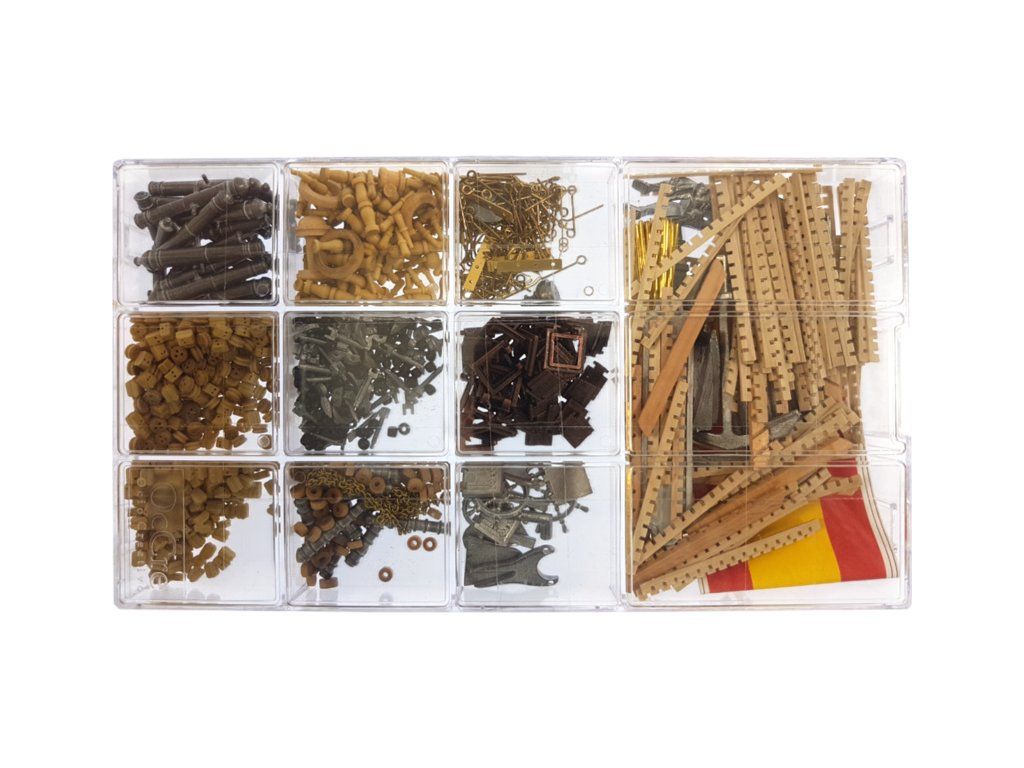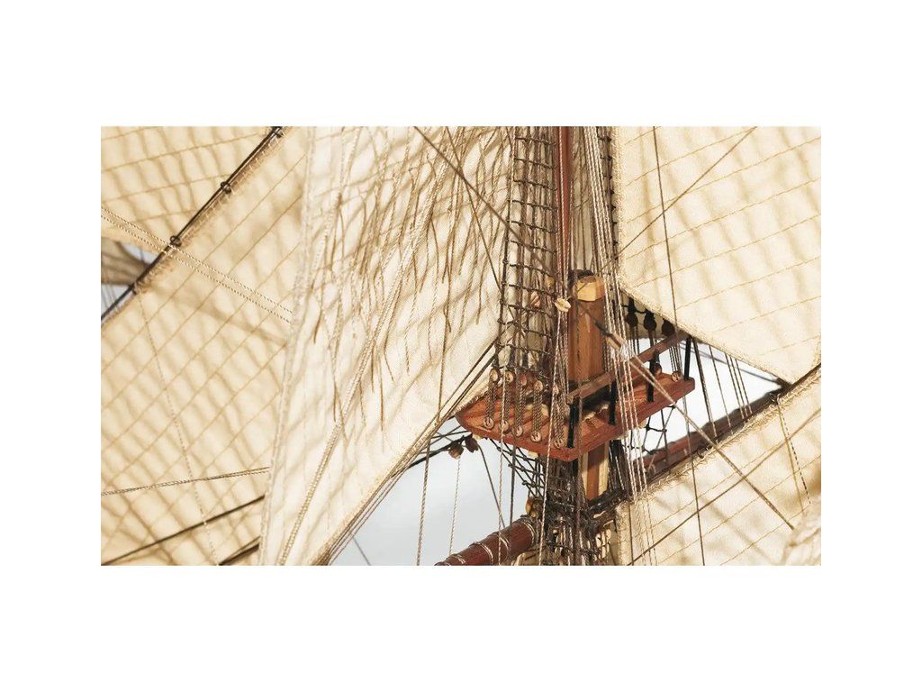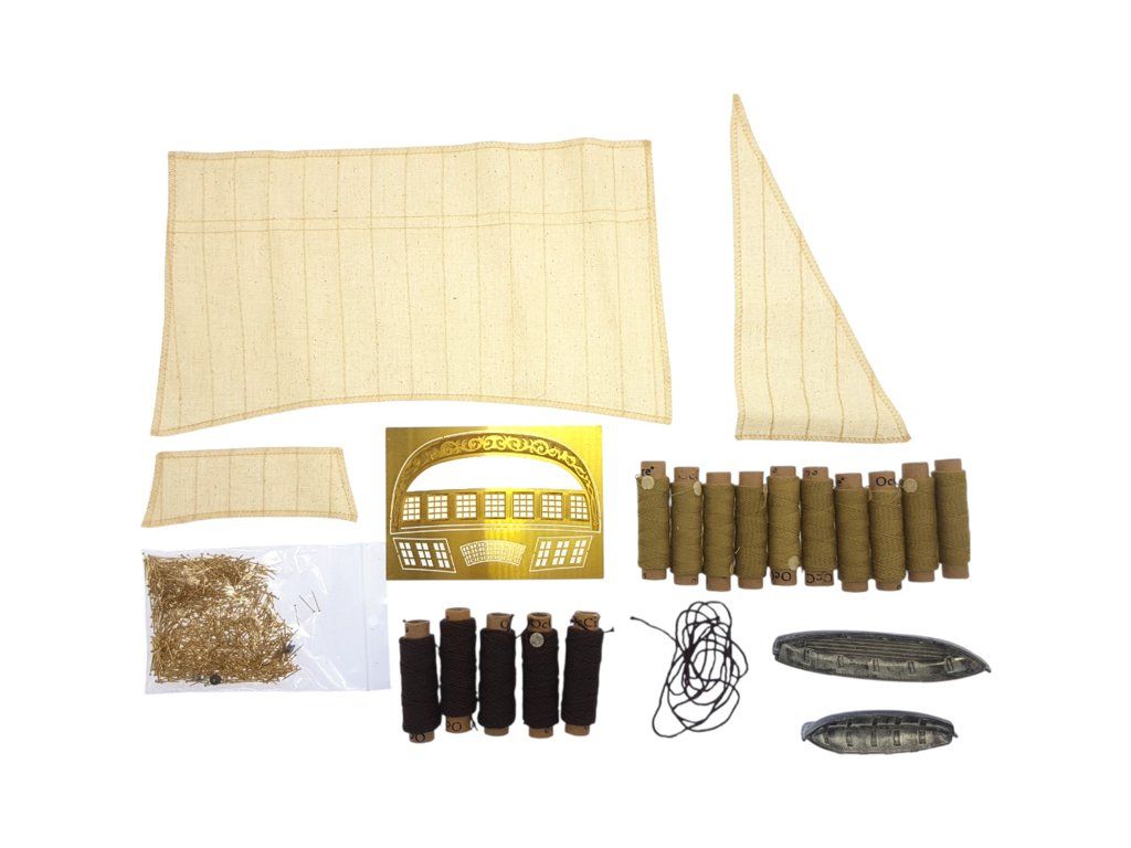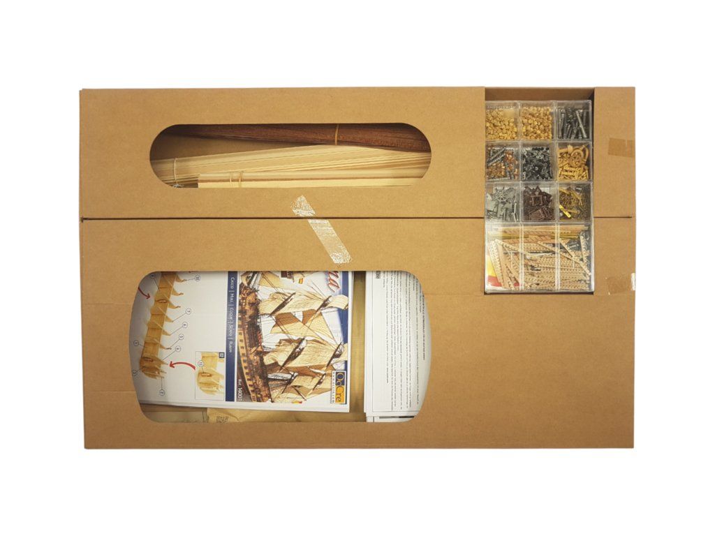Balení obsahuje laserem řezané plošné dřevěné díly, plaňky, stožáry, frézované dřevěné díly, kovové odlitky, mosazné díly, mosazné fotolepy, lanoví, ušité plachty, vlajku. Návod a stavební výkresy.