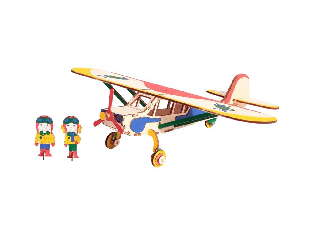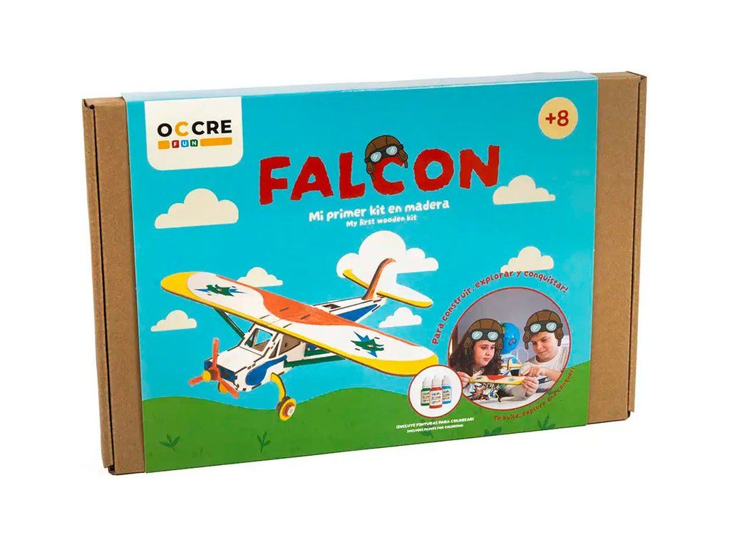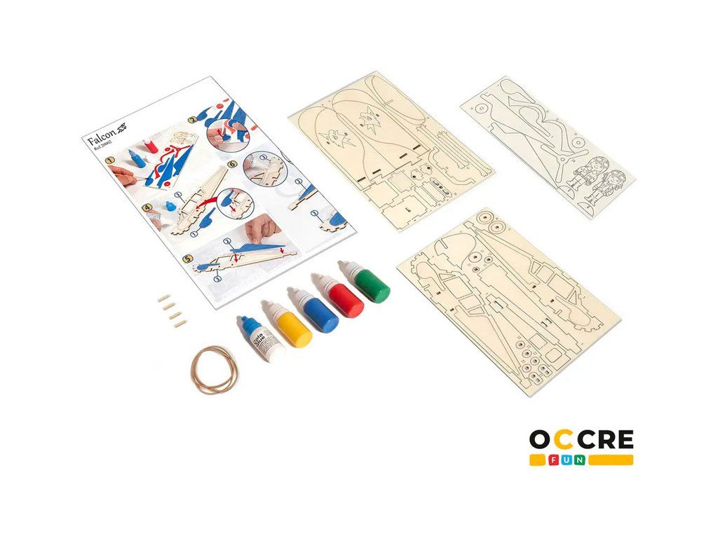 Stavebnice pro děti OCCRE Letadlo Falcon. Balení obsahuje: předřezané dřevěné díly, akrylové barvy a štětec, gumičky pro sestavení, bílé lepidlo, barevný ilustrovaný návod krok za krokem.