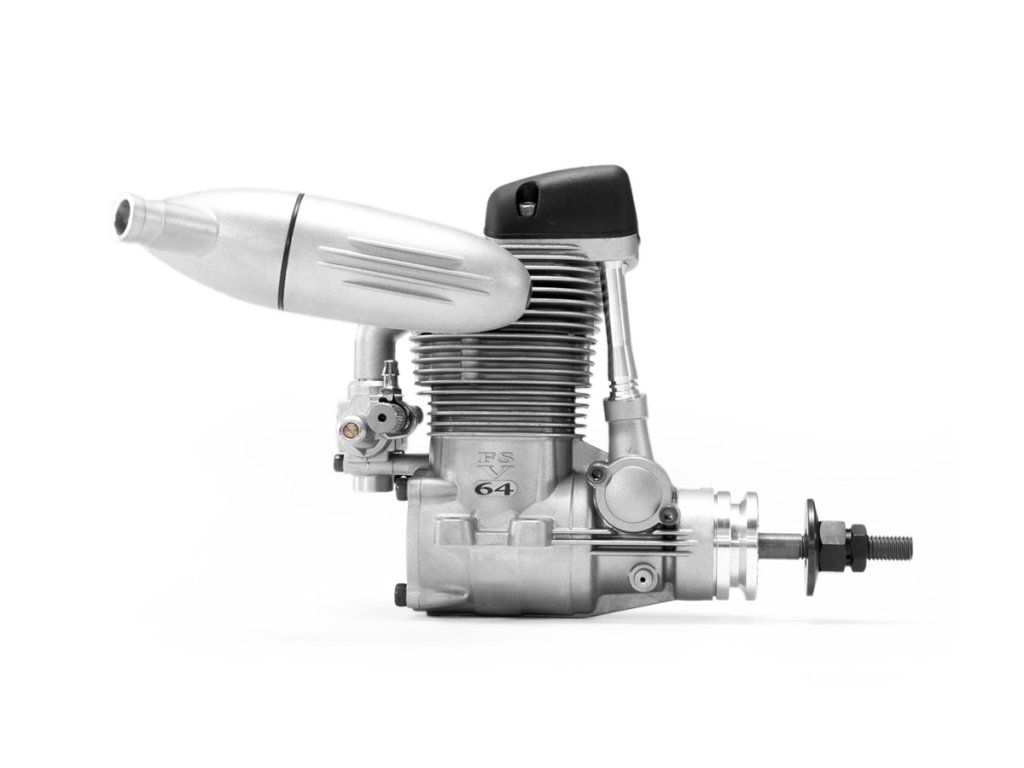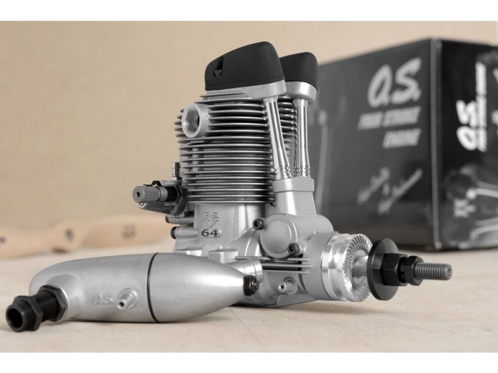 FS 64V je čtyřdobý motor s ventilovým rozvodem konstruovaný pro modely letadel všeho druhu, zvláště vhodný je pro RC makety. Je osazen dvoujehlovým karburátorem typu 61T. V základní sestavě je dodáván rovněž expanzní tlumič výfuku typy F-4050. Orientaci výfukového hrdla je možno měnit otáčením zadní části tlumiče o 360°, orientaci těla tlumiče a vzdálenost mezi hlavou válce a tlumičem je možno nastavovat díky závitové přechodce.