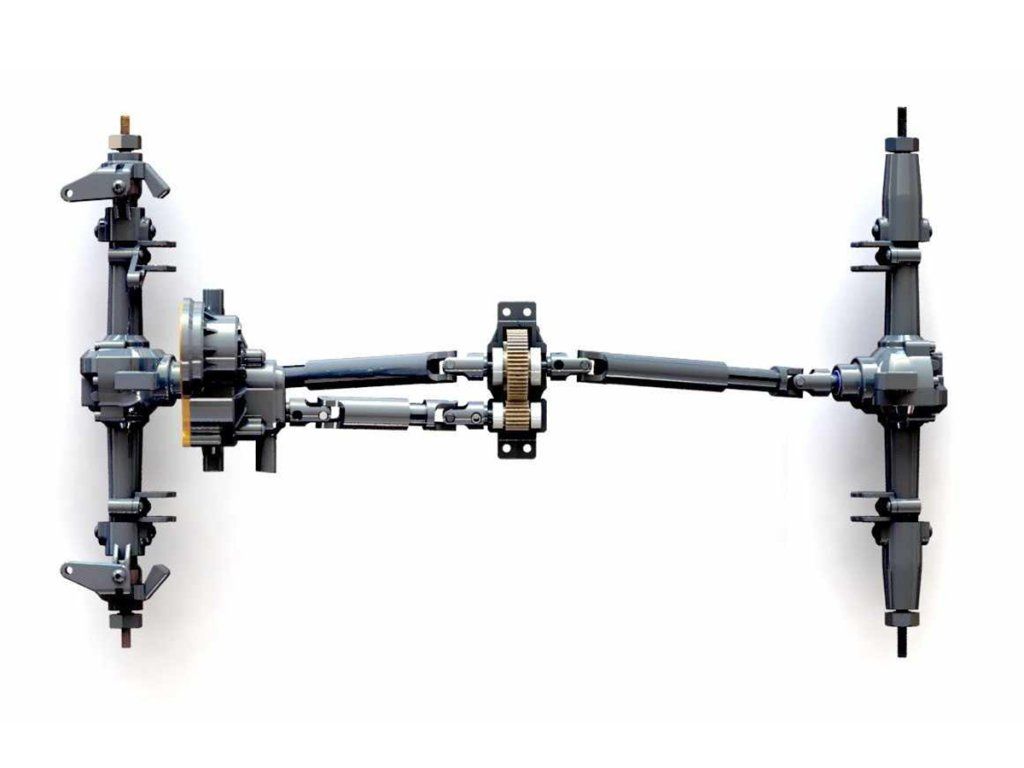 - Uložení motoru a převodovky vpředu pro zatížení a zvýšení trakce předních kol a snížení pravděpodobnosti převrácení modelu při strmém stoupání.