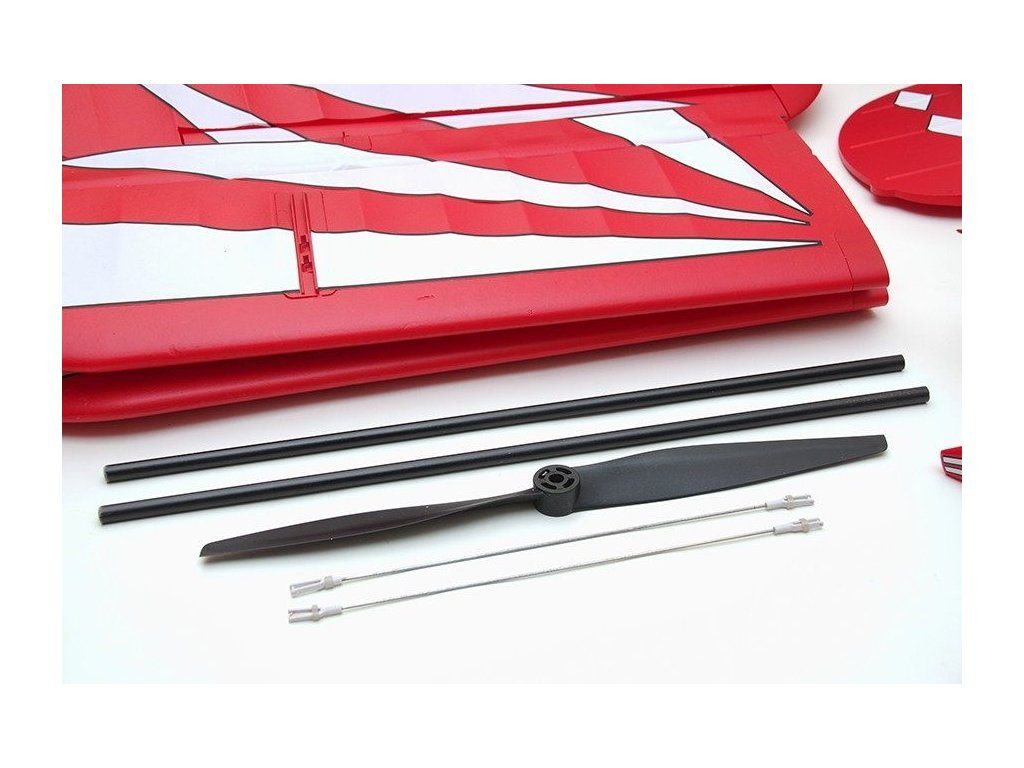 ARF set obsahuje: téměř hotový model se střídavým motorem, vrtulí, regulátorem otáček 50A, 4 servy, sadou příslušenství a návodem.