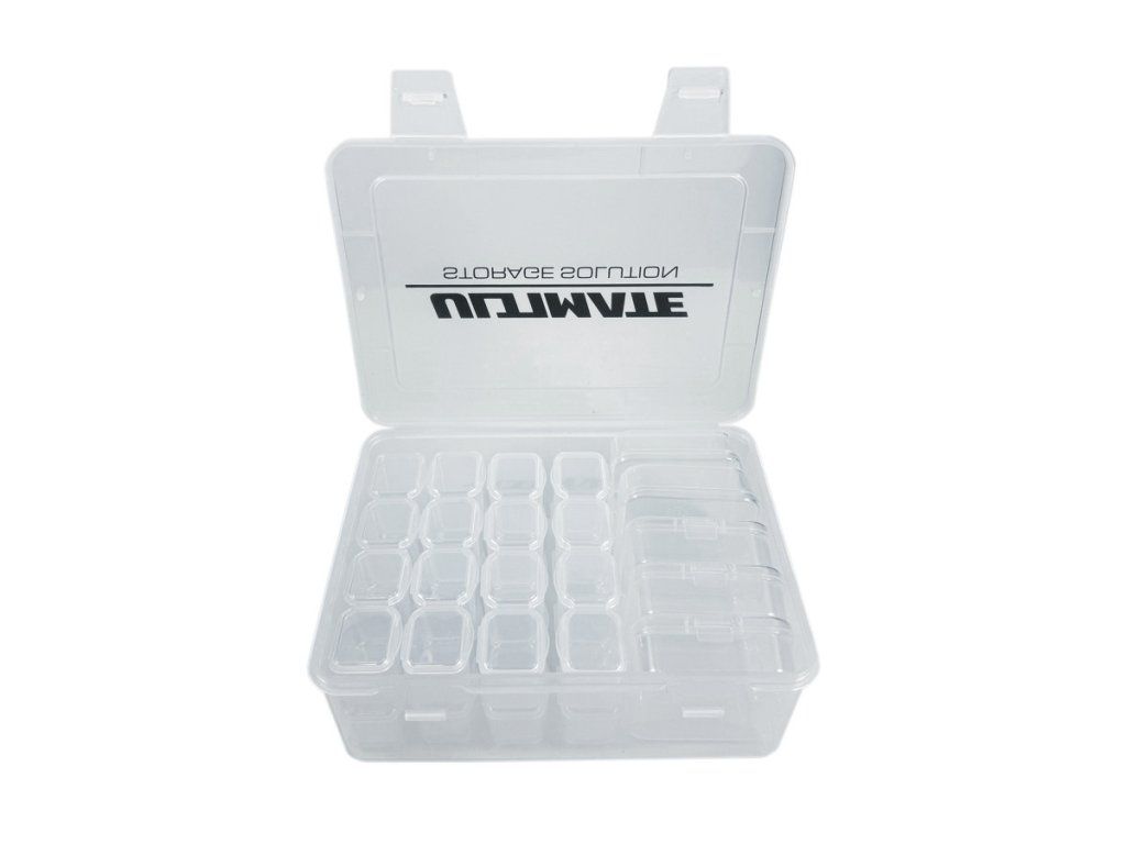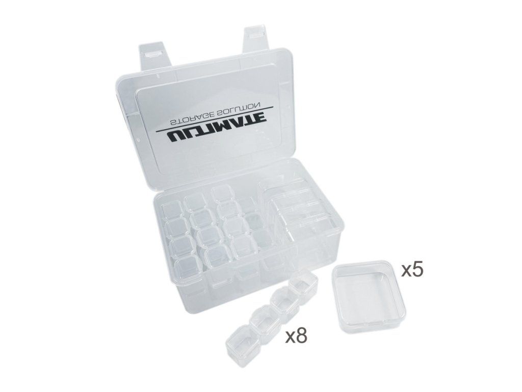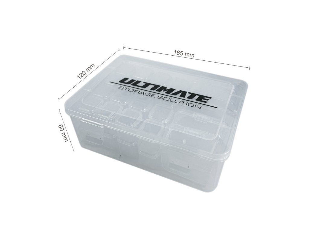 Pevný, odolný, průsvitný box o rozměrech 165x120x60 mm obsahuje 5 vnitřních boxů o rozměrech 55x55x20 mm a 32 boxů o rozměrech 24x20x24 mm se samostatným uzamykatelným víkem pro rychlé a snadné uložení dílů.
