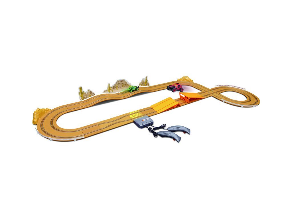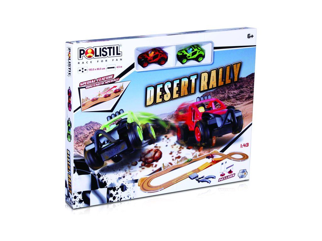Polistil Desert Rally - analogová elektrická autodráha v měřítku 1:43. Trať s imitací šotoliny a spoustou zábavných prvků: skokánkem, zúžením, křižovatkou a terénními vlnami. Napájení tužkovými bateriemi. Autíčka Buggy Rally. Délka tratě 4,5 m, plocha pro rozložení 193,5 x 80,5 cm.