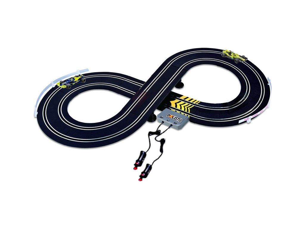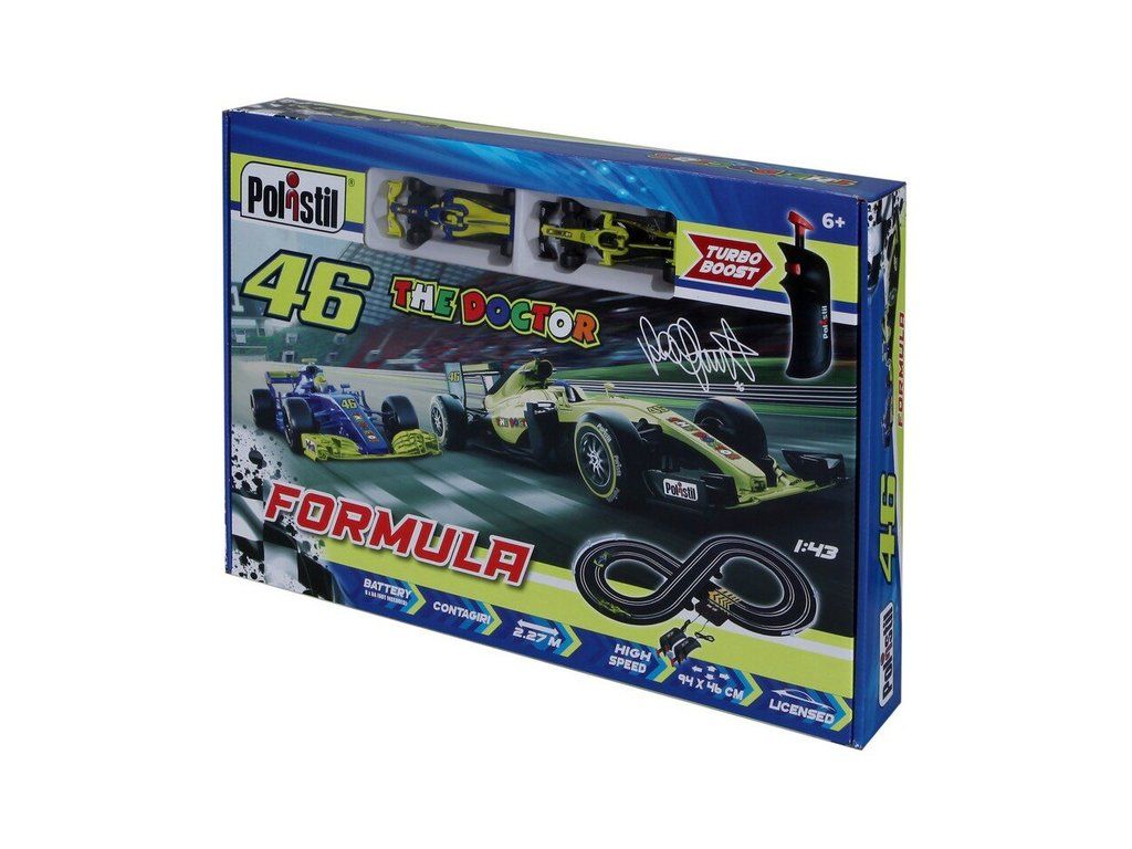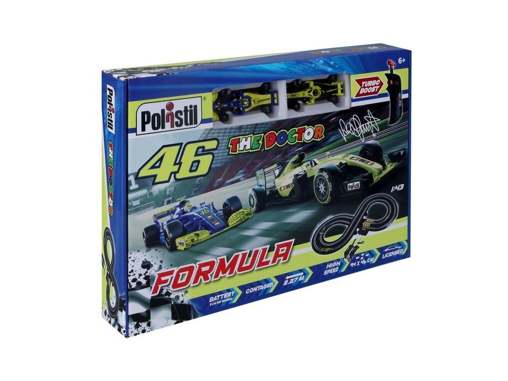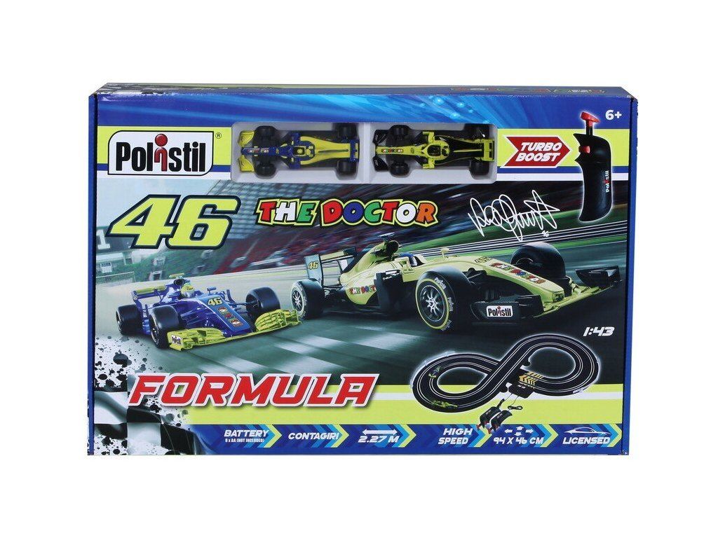 Polistil VR46 Formula Racing - analogová elektrická autodráha v měřítku 1:43. Klasický tvar osmičky s mostem pro vyrovnané závody. Napájení tužkovými bateriemi. Autíčka formule s motivem Valentino Rossi "46 The Doctor". Délka tratě 2.27 m, plocha pro rozložení 94 x 46 cm.